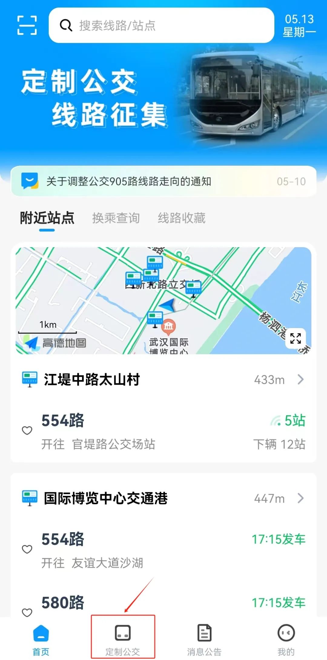 下载武汉公交APP,进入“定制公交”页面。
