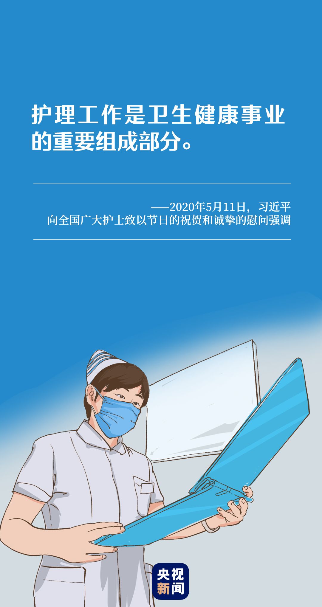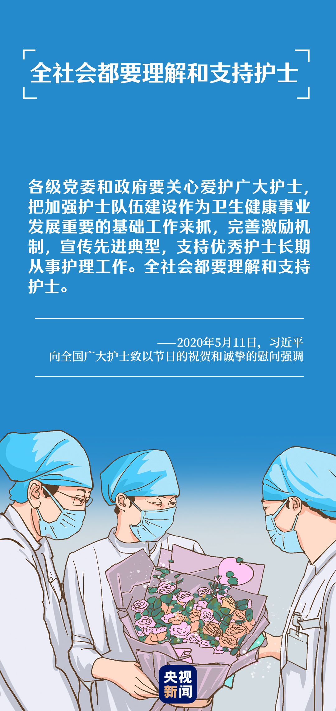 习近平总书记十分关心护士群体,要求各级党委和政府关心爱护广大护士,全社会都要理解和支持护士。