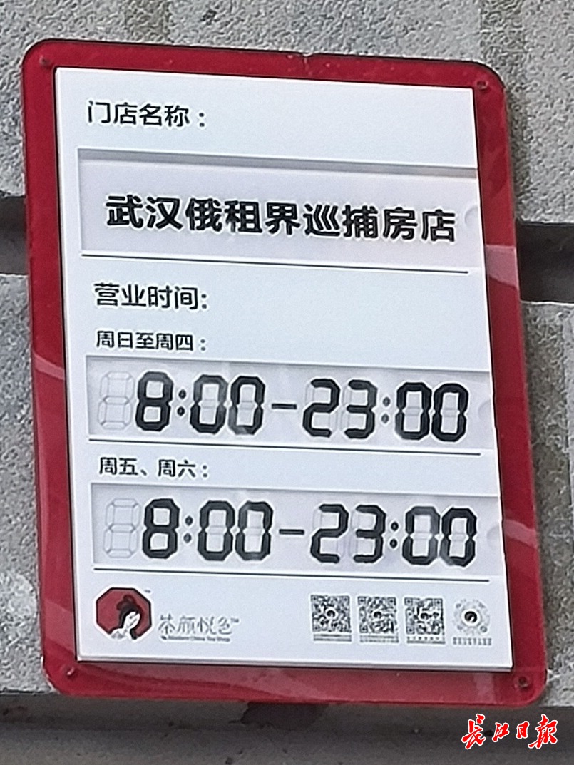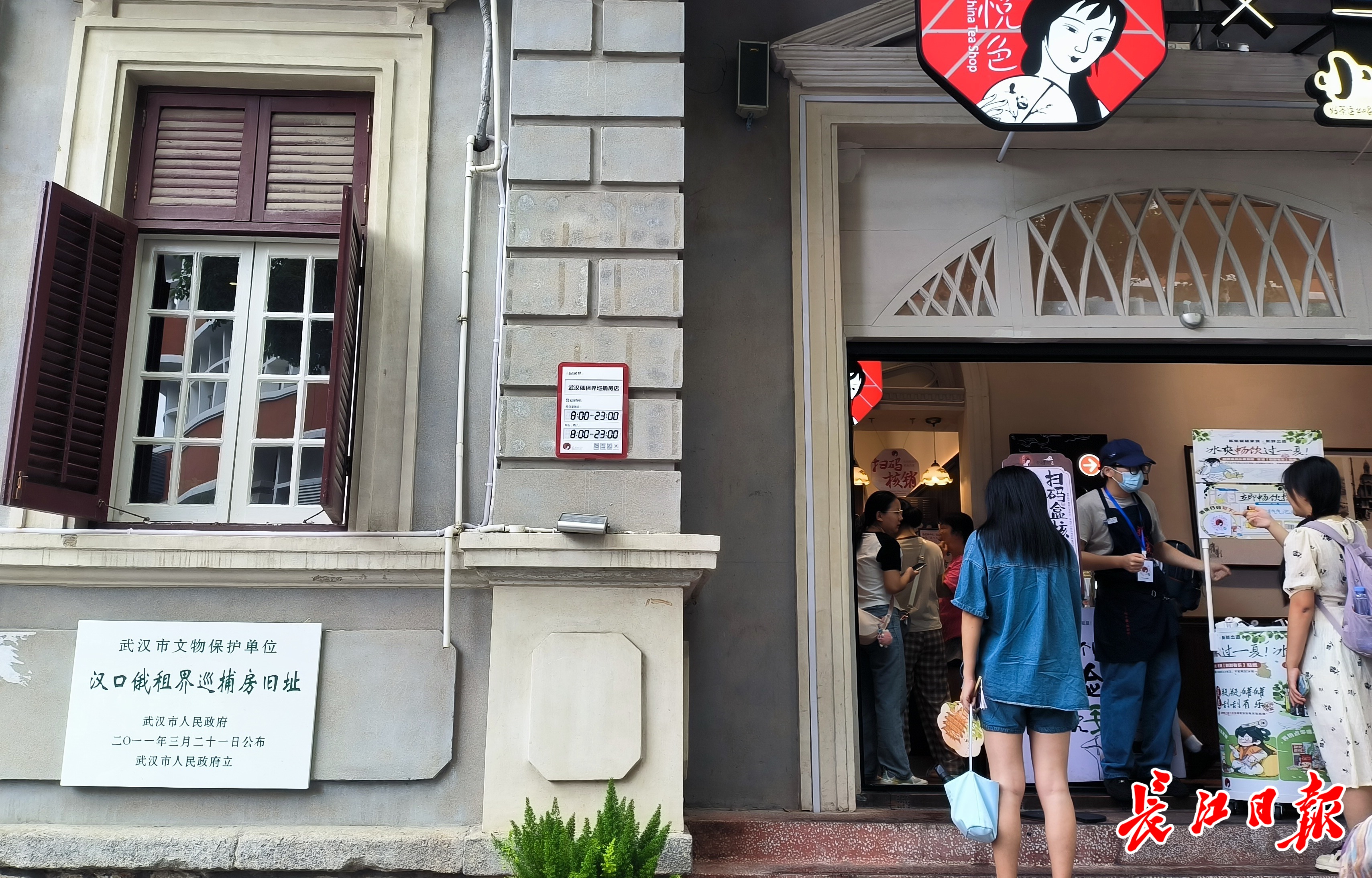 7月11日10时,记者找到了这家店。记者看到,不少顾客在店门口点单,还有游客在此拍照留念。店门旁挂着一个A3打印纸大小的招牌,写着“武汉俄租界巡捕房店”的分店名称。招牌左下方,写有“汉口俄租界巡捕房旧址”的文保单位标志牌嵌在墙上。