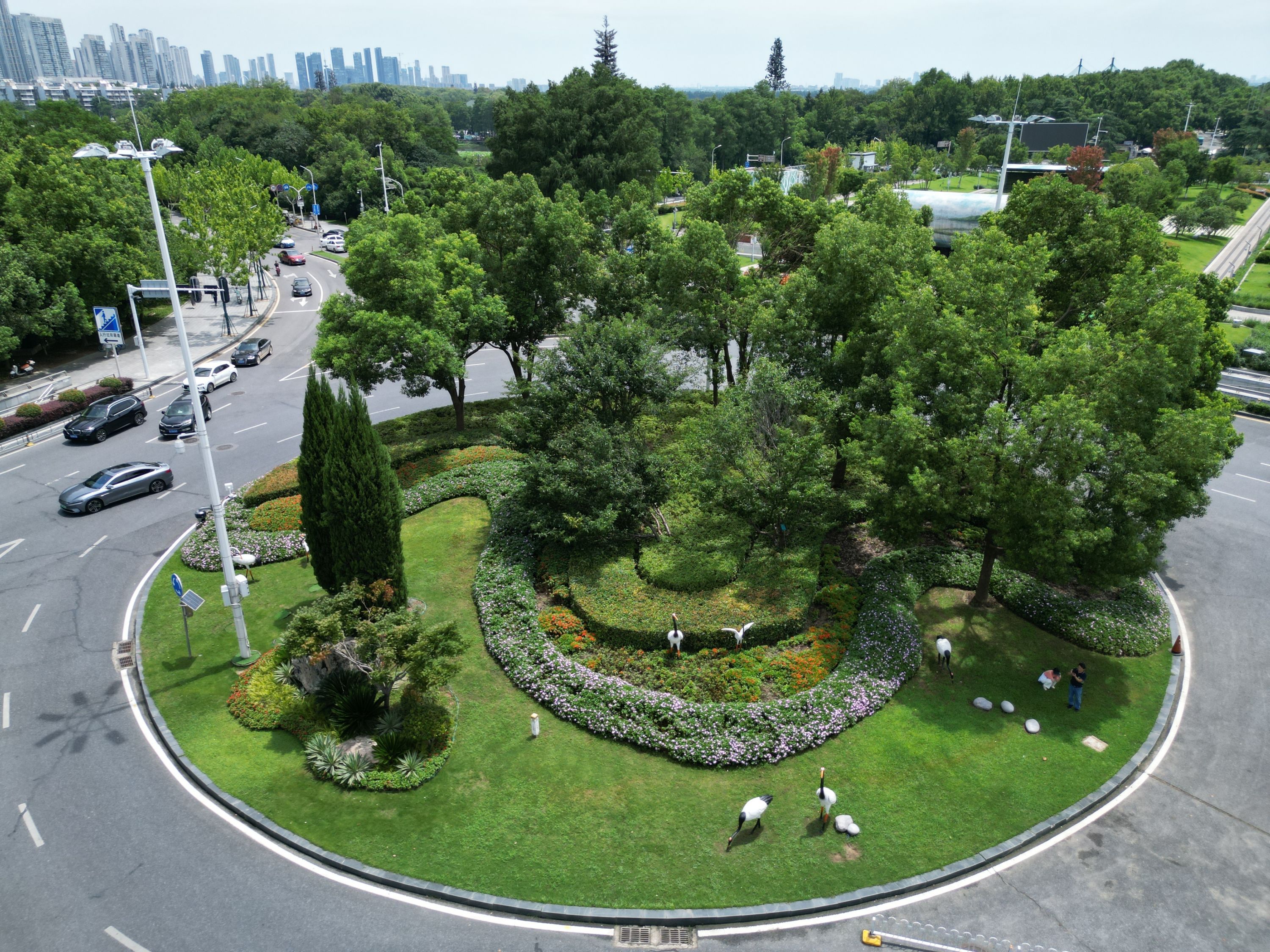 梨园转盘的圆形花坛,中间是树林,周围是草坪,武昌区园林主管部门在树林与草坪之间,用红、粉两种颜色的桑蓓斯凤仙花拼出图案,并点缀了7只形态各异的“丹顶鹤”。