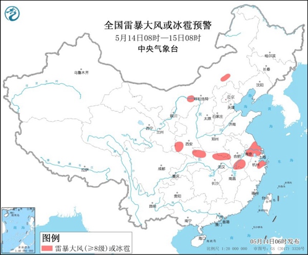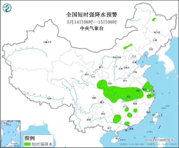 预计5月14日08时至15日08时,内蒙古南部、陕西中南部、河南南部、安徽中南部、江苏中南部、上海北部、湖北北部和西部、江西北部、浙江北部等地的部分地区将有8-10级雷暴大风或冰雹天气;内蒙古中部、黑龙江西北部、河南南部、安徽中南部、江苏中南部、上海北部、湖北、湖南北部、江西北部和南部、浙江北部、四川盆地东北部、重庆东北部、广西东北部、广东中部和西北部等地的部分地区将有短时强降水天气,小时雨强20-50毫米,局地可达70毫米以上。