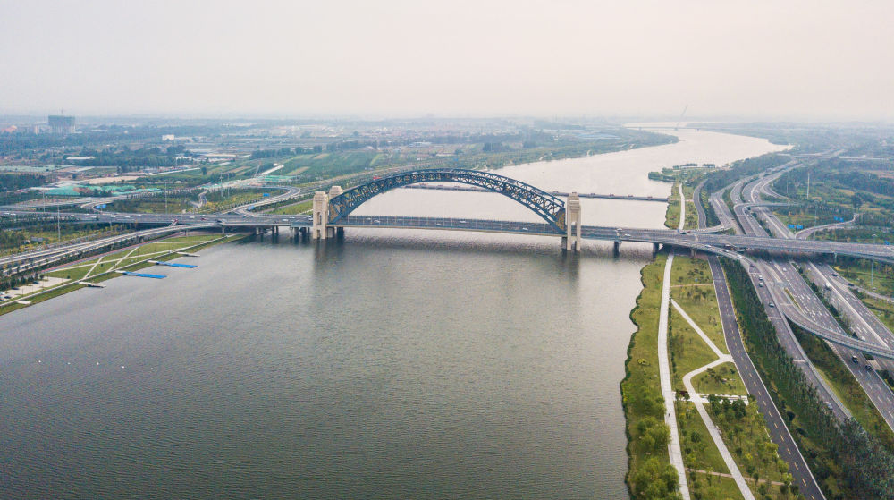 ↑2020年9月21日在山西太原拍摄的汾河三期治理工程晋阳桥段(无人机照片)。