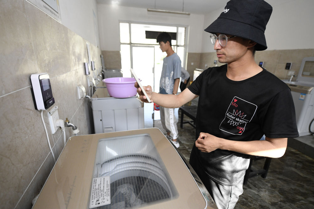 ↑ 宁夏建设职业技术学院学生在洗衣房通过APP扫码进行计量式用水(5月12日摄)。