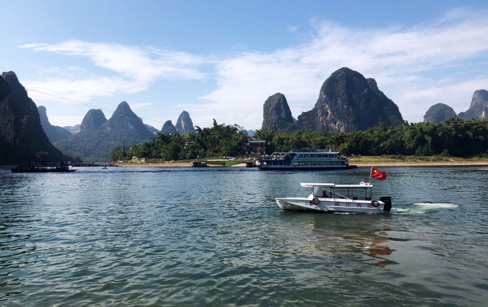 ↑执法船在漓江上巡查(2019年11月14日摄)。