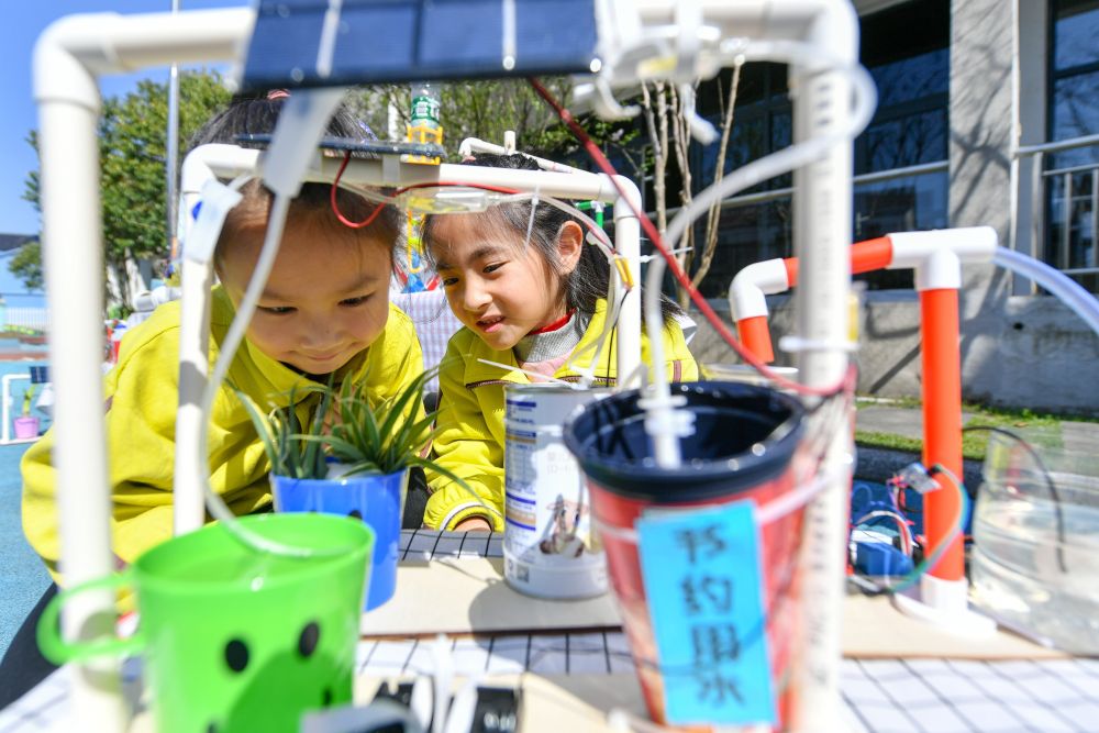 ↑3月22日,浙江省湖州市长兴县泗安镇中心幼儿园的孩子们体验节水环保科技小发明。