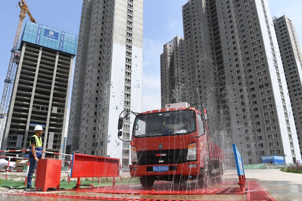 ↑ 在甘肃省兰州市中建三局一处建设工地上,感应式的洗车台利用循环再生水冲洗车辆,并对污水再次回收利用(5月12日摄)。