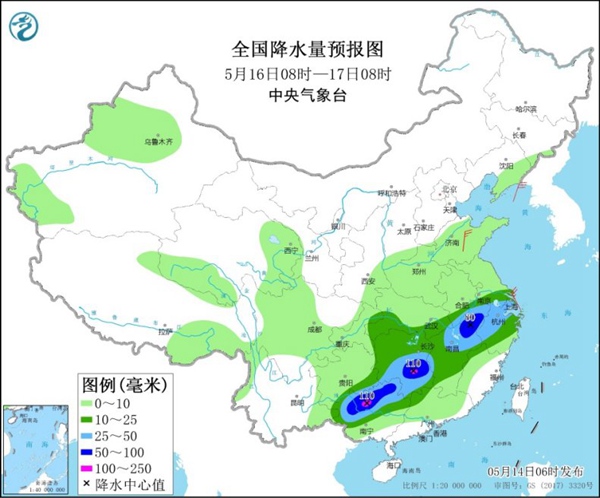 16日,江淮南部、江汉东部、江南大部、华南西北部等地的部分地区有中到大雨,其中,安徽南部、湖南南部、江西北部、广西北部等地的部分地区有暴雨,局地大暴雨。