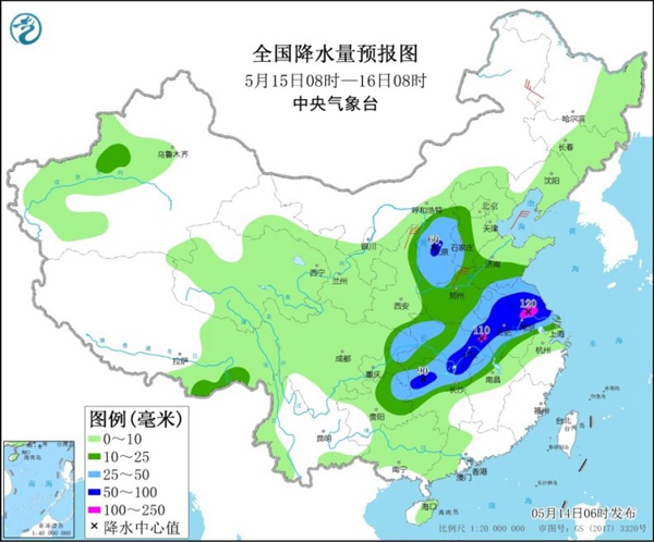 中央气象台预计,15日,华北中西部、黄淮、江淮、江汉、江南西北部、西南地区东部等地的部分地区有中到大雨,其中,山西中部、河南南部、安徽中北部、江苏中南部、湖北东部、湖南北部等地的部分地区有暴雨,局地大暴雨。