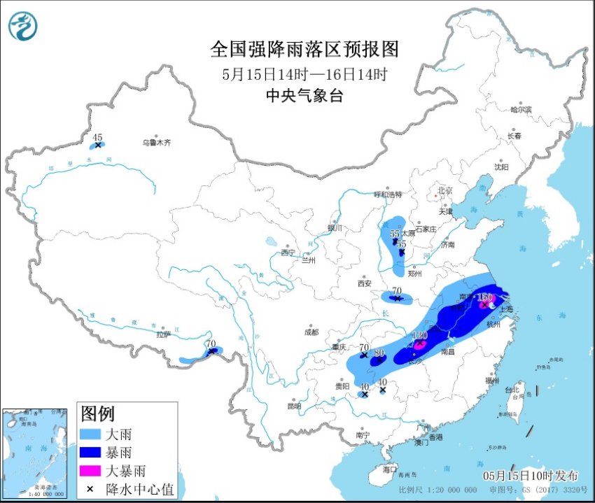 预计,5月15日14时至16日14时,山西中南部、河南南部和西北部、重庆东南部、湖北北部和东部、安徽、江苏中南部、上海、浙江北部、江西北部、湖南中北部、贵州东部、广西北部等地的部分地区有大到暴雨,其中,湖南东北部、安徽东南部、江苏南部等地局地有大暴雨(100~150毫米)。上述部分地区伴有短时强降水,小时降雨量30~50毫米,局地可达70毫米以上,局地伴有雷暴大风或冰雹等强对流天气。