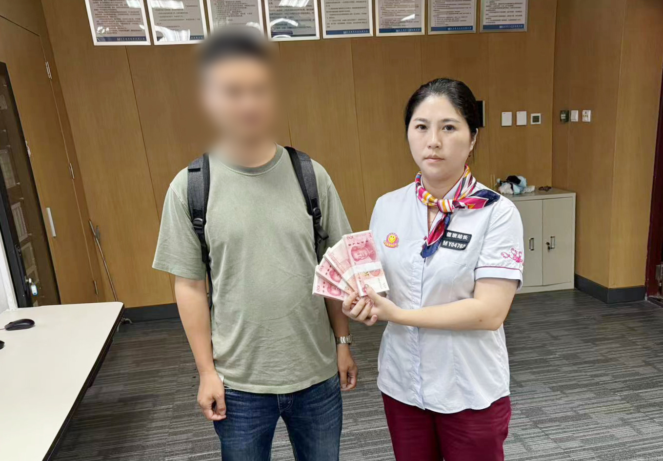 茹先生的朋友来代领4万元现金,右为值班站长宋娟。通讯员供图