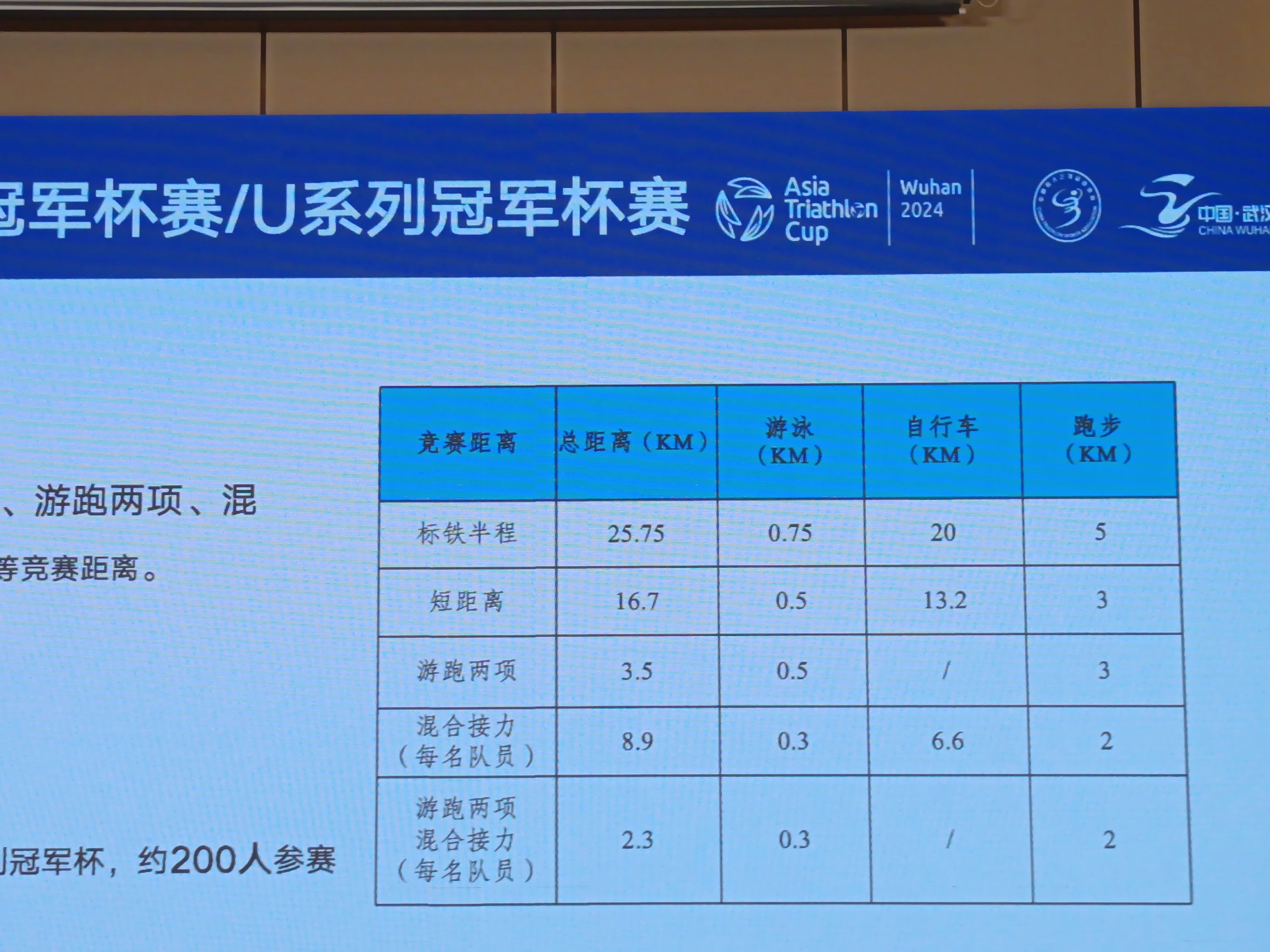 本次比赛集2024年武汉铁人三项亚洲杯赛、2024年武汉全国铁人三项冠军杯系列赛暨U系列冠军杯赛以及2024年中国·武汉铁人三项公开赛于一体,首次将铁人三项的多个高端赛事集结于一城举办。比赛设标铁全程、标铁半程、短距离、混合接力、游跑两项、游跑两项混合接力、骑跑两项接力等竞赛距离。