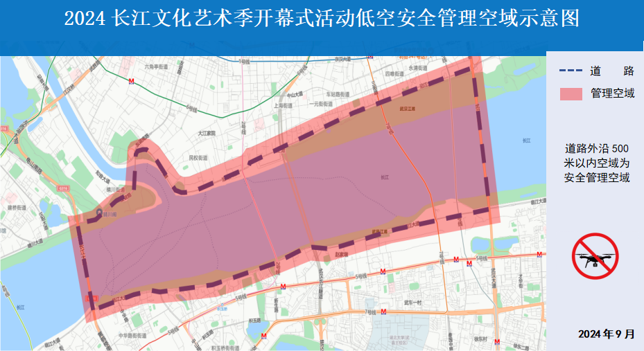 安全管理区域:2024长江文化艺术季开幕式活动区域、长江江段及周边道路向外延伸500米以内区域,真高120米及以下空域为临时管制空域。活动区域外围线路:沿江大道龙王庙→沿江大道长江二桥→长江二桥桥面→武昌临江大道长江二桥→武昌临江大道长江大桥→长江大桥桥面→晴川大道长江大桥→晴川大道晴川桥→晴川桥桥面→沿河大道晴川桥→沿河大道龙王庙。