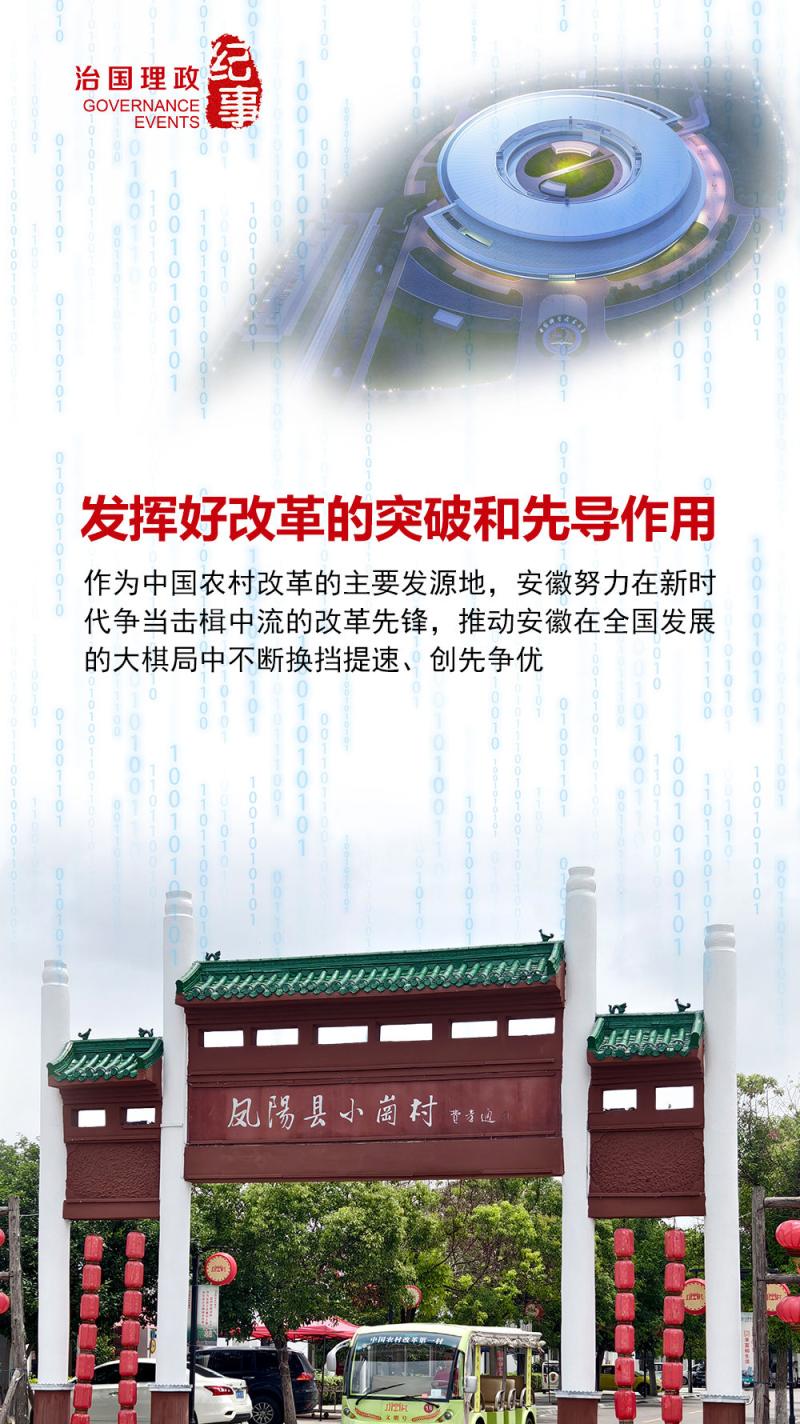 牢记嘱托,勇毅前行。作为中国农村改革的主要发源地,安徽努力在新时代争当击楫中流的改革先锋,推动安徽在全国发展的大棋局中不断换挡提速、创先争优。