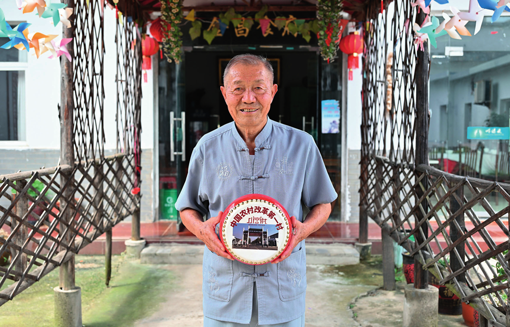 安徽凤阳小岗村“大包干” 带头人严金昌在自家开办的农家 乐里展示小岗村旅游纪念品凤阳 花鼓(2024 年 7 月 25 日摄) 李鑫摄 / 本刊