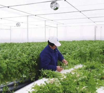 空港湿地花田智慧蔬菜工厂里无土栽培蔬菜。