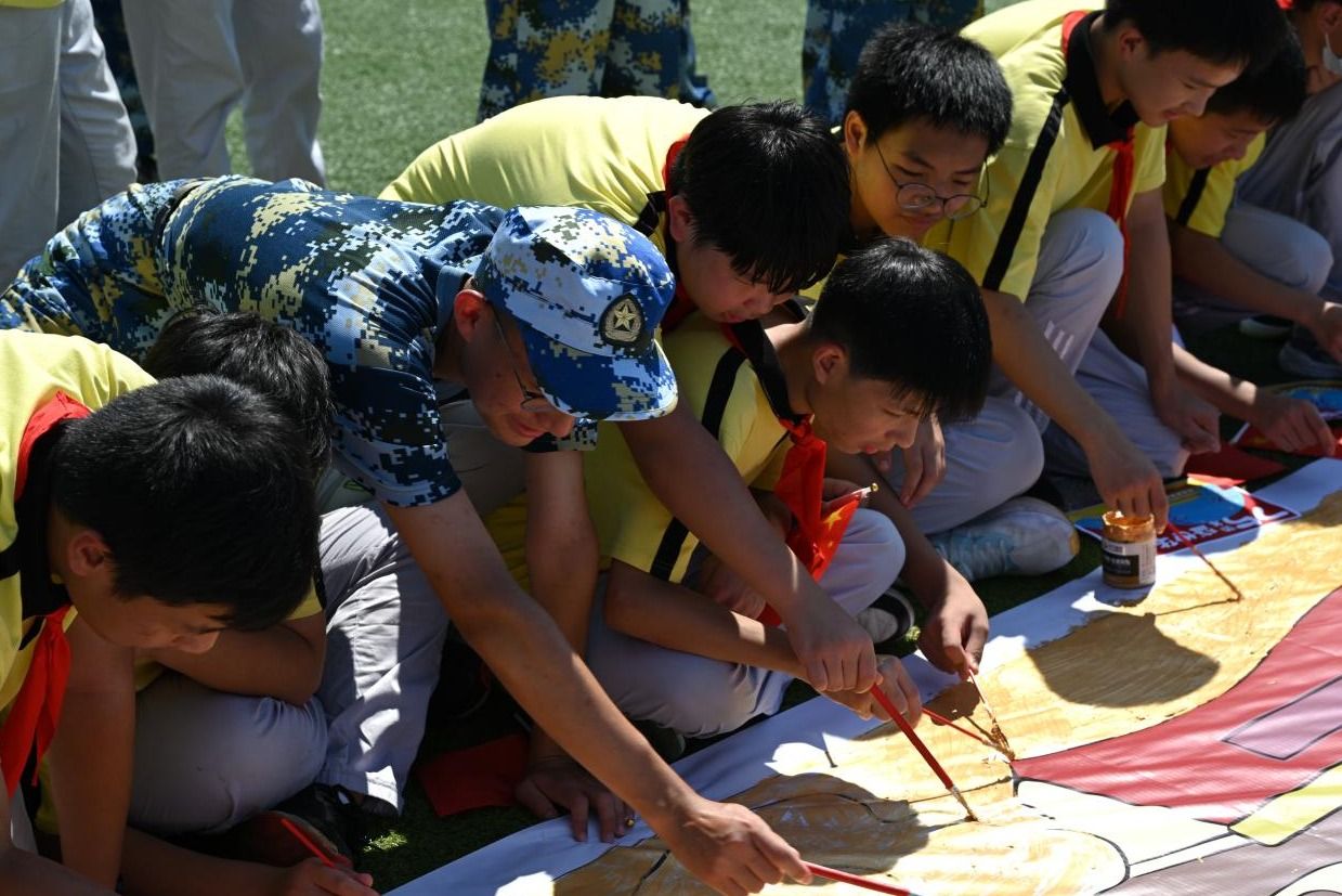 现场千余人共同唱响了《强军战歌》《我和我的祖国》,将整个活动推向高潮。嘹亮的歌声、舞动的红旗、快乐的脸庞,汇聚成一片欢乐祥和的红色海洋。随着长4.3米、宽3米的“75周年盛世华诞”图案的展开,初中生代表与退役军人们齐上前,各自占据“一方天地”,用手中的画笔和颜料共同绘就心中最美的幸福色彩。