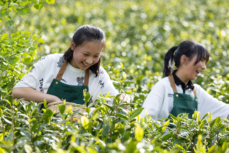 浙江安吉,游客在茶园里体验采茶