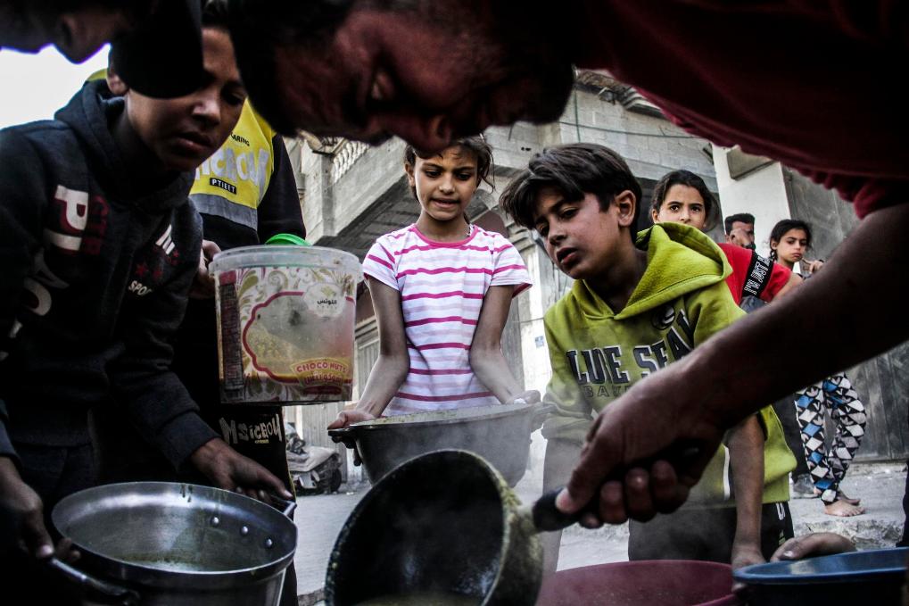 10月23日,人们在加沙地带北部的加沙城领取救济食品。新华社发(马哈茂德·扎基摄)