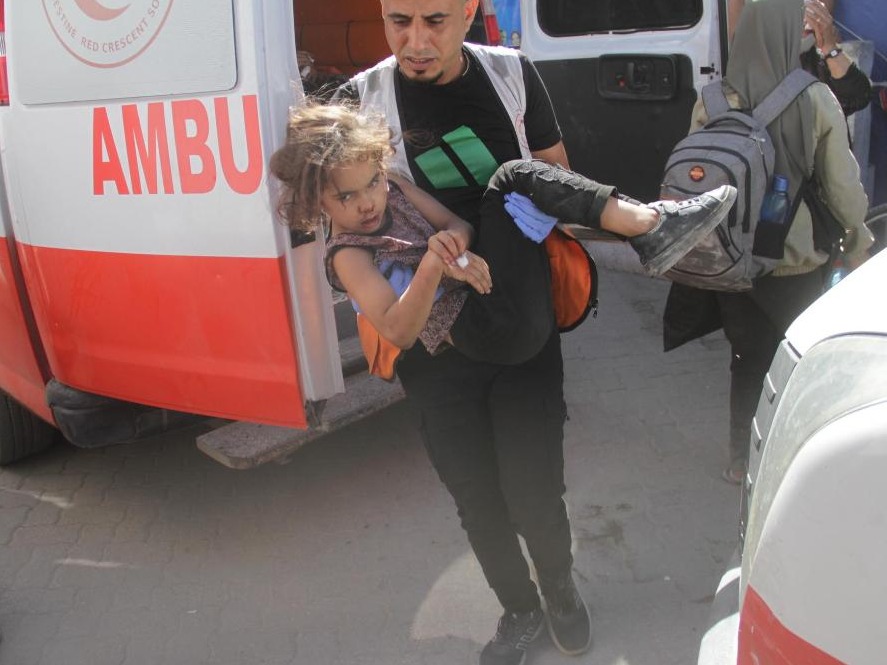 10月21日,在加沙地带北部谢赫拉德万的医院,一名男子抱着受伤的孩子。新华社发(马哈茂德·扎基摄)
