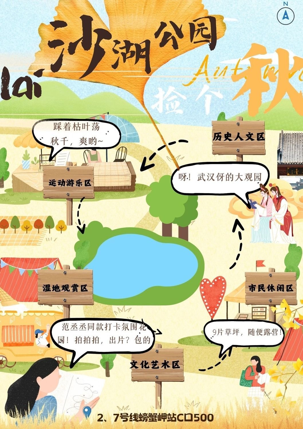 “我把打卡地和观景地都囊括进去了,最推荐的是紫薇苑,那里拍照很出片。”来自广告学专业的潘怡君是黄鹤楼公园游园图的主创人员,在图上除了交通信息,还特别备注了一句打卡推荐语:是赏秋宝地,楼山江于一体。