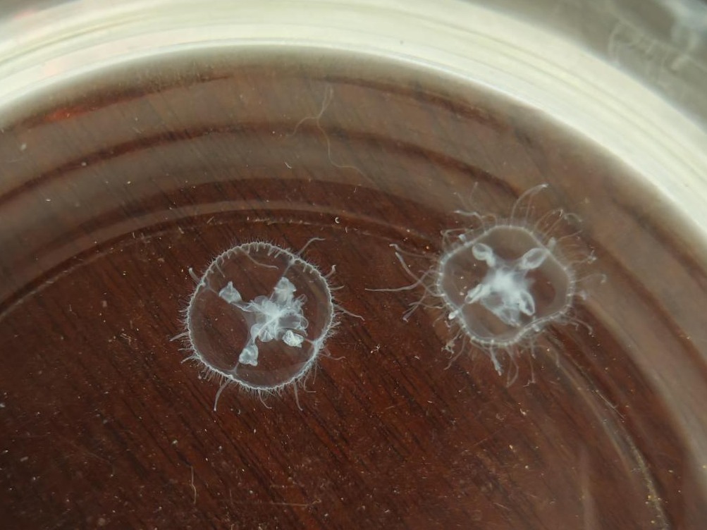 20天后,秦赫得偿所愿,取到了一只活体。秦赫拿出手机,给记者看他拍摄的“杰作”:两只硬币大小的桃花水母在量杯底部畅快地游动。这激发了记者的期待。