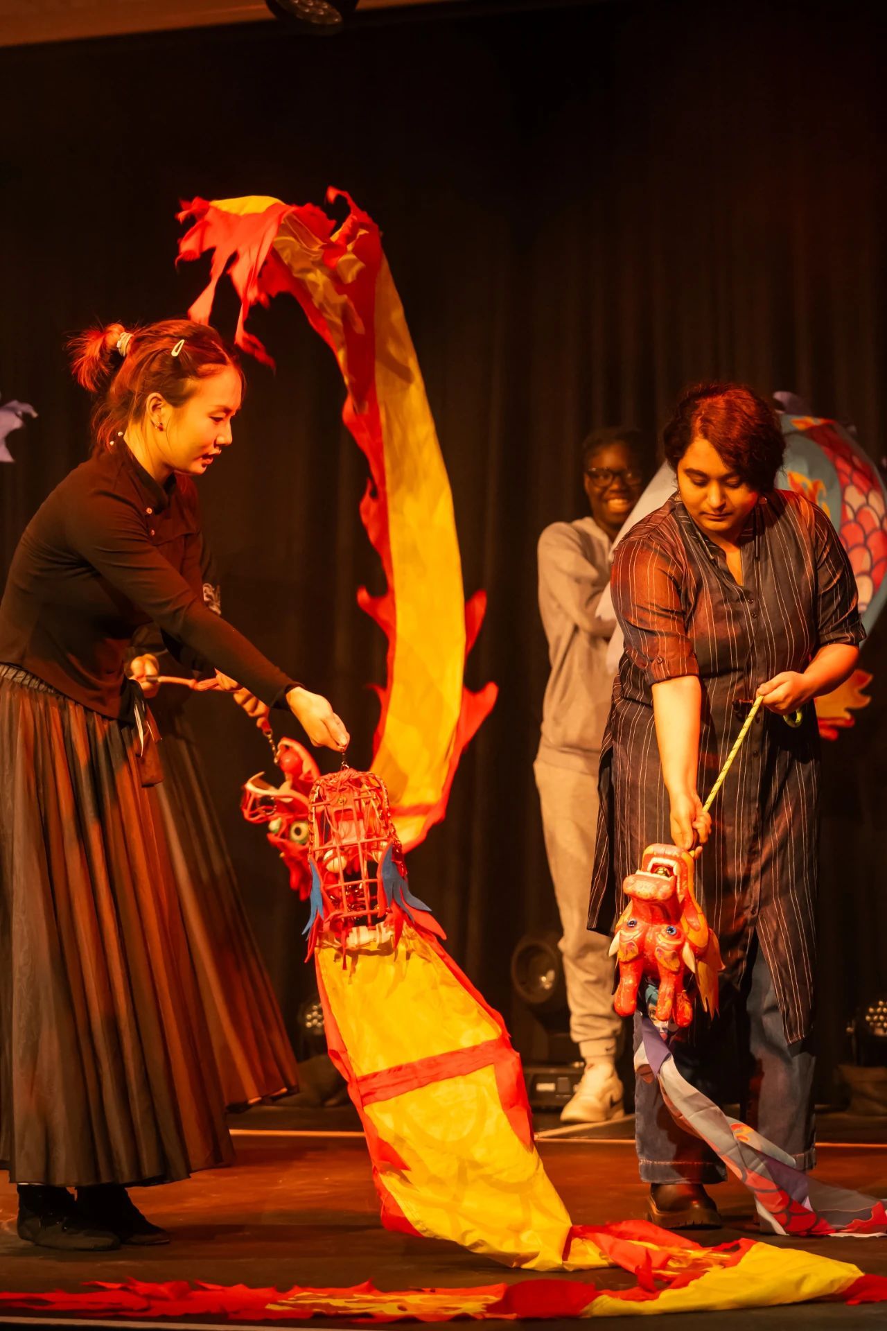 马飞龙(右)为欧洲的友人展示龙狮。