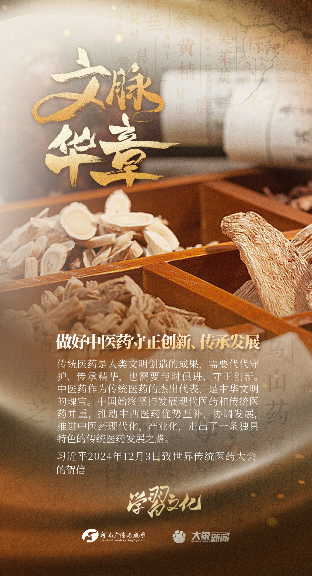 2024年12月3日,国家主席习近平向2024世界传统医药大会致贺信。习近平指出,传统医药是人类文明创造的成果,需要代代守护、传承精华,也需要与时俱进、守正创新。