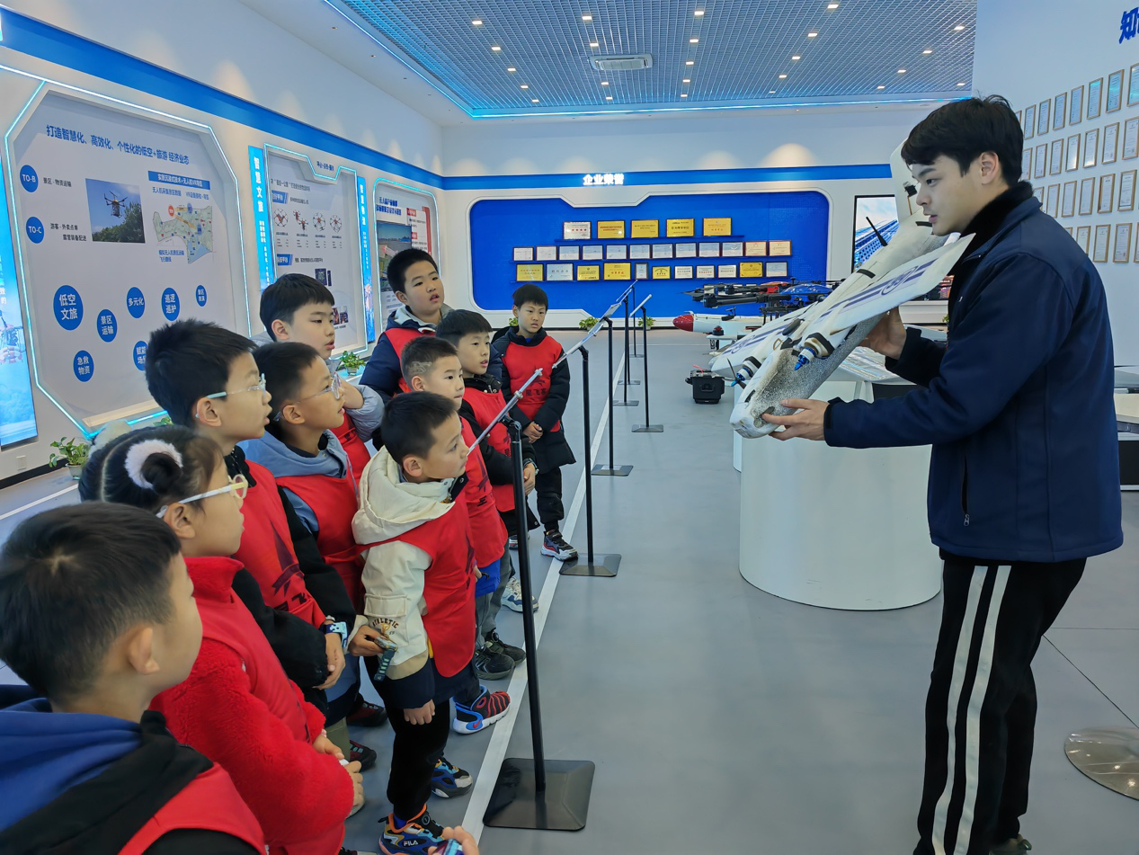 12月14日,尹力所在的公司员工在飞行科普基地向孩子们展示无人机。