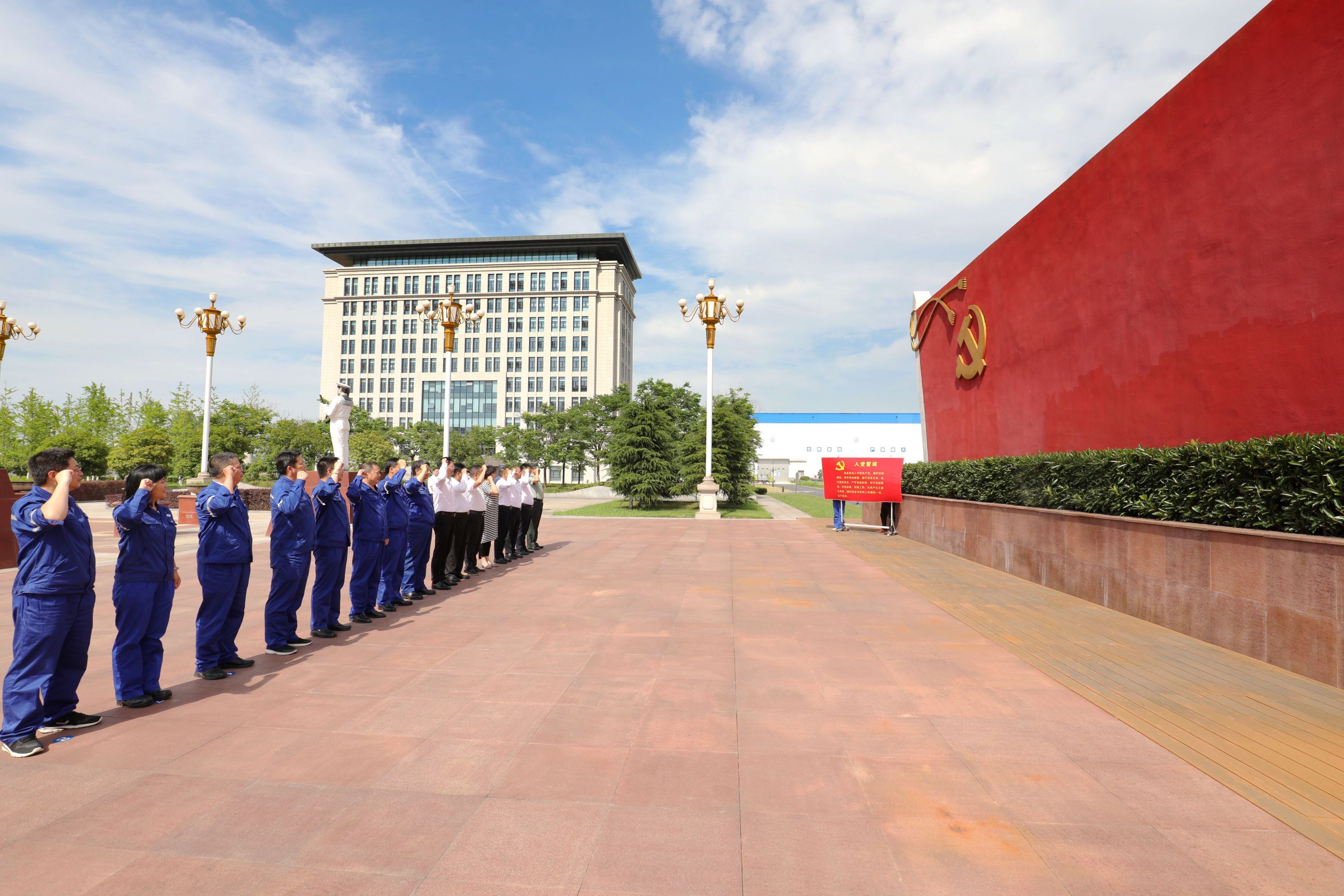 “我志愿加入中国共产党,拥护党的纲领,遵守党的章程……”全体党员佩戴党徽,踏上伟人广场,庄重地面向鲜艳的党旗,举起右拳,一起重温入党誓词。