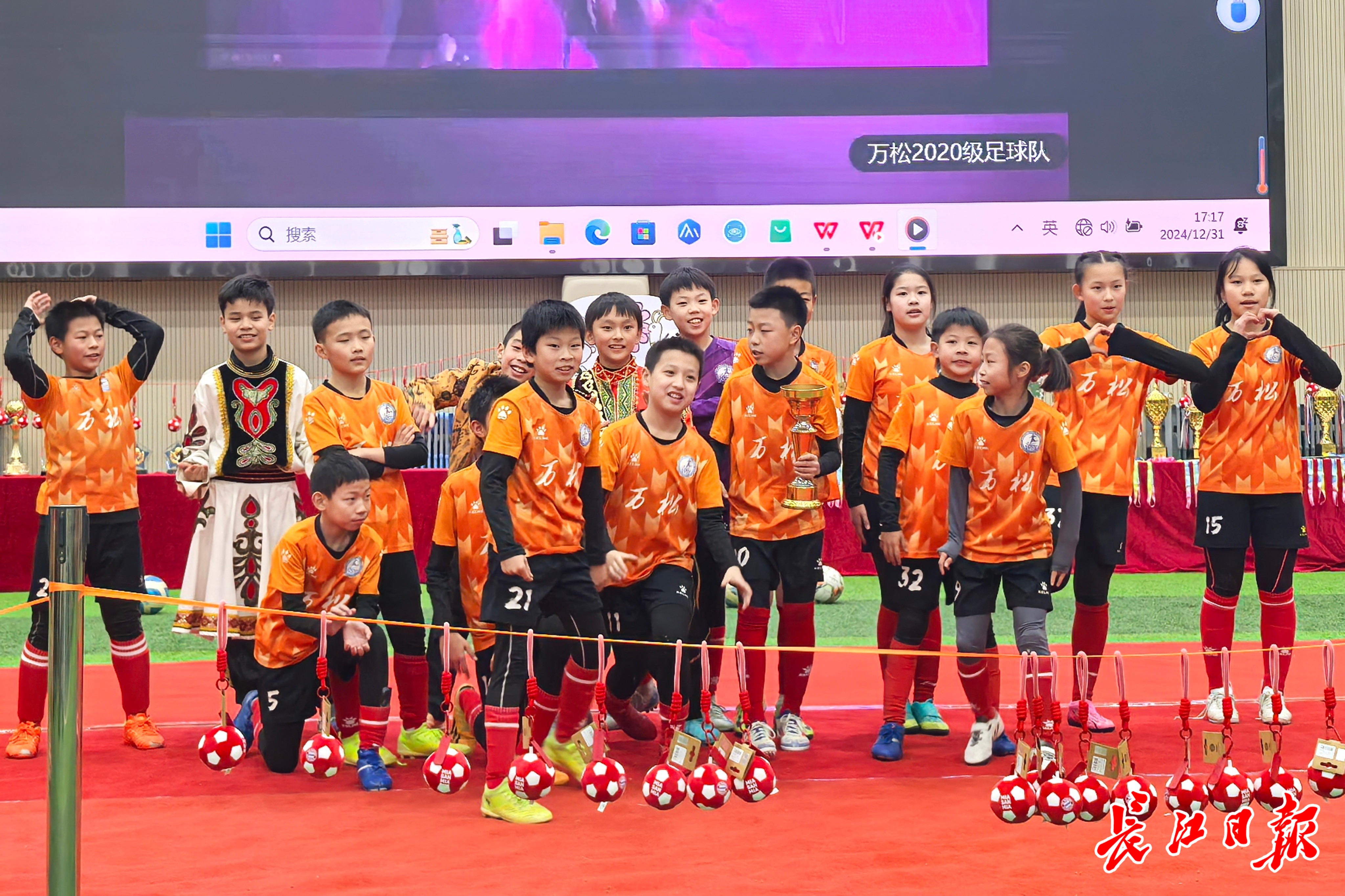 长江日报大武汉客户端1月1日讯(记者马万勇)2024年12月31日晚,武汉市江汉区万松园路小学的校园内热闹非凡。随处可见的德国拜仁慕尼黑俱乐部元素,常卫魏、姜坤等冠军教练莅临,十余座金光闪闪的奖杯……无不显露出这所小学耀眼的足球光彩。