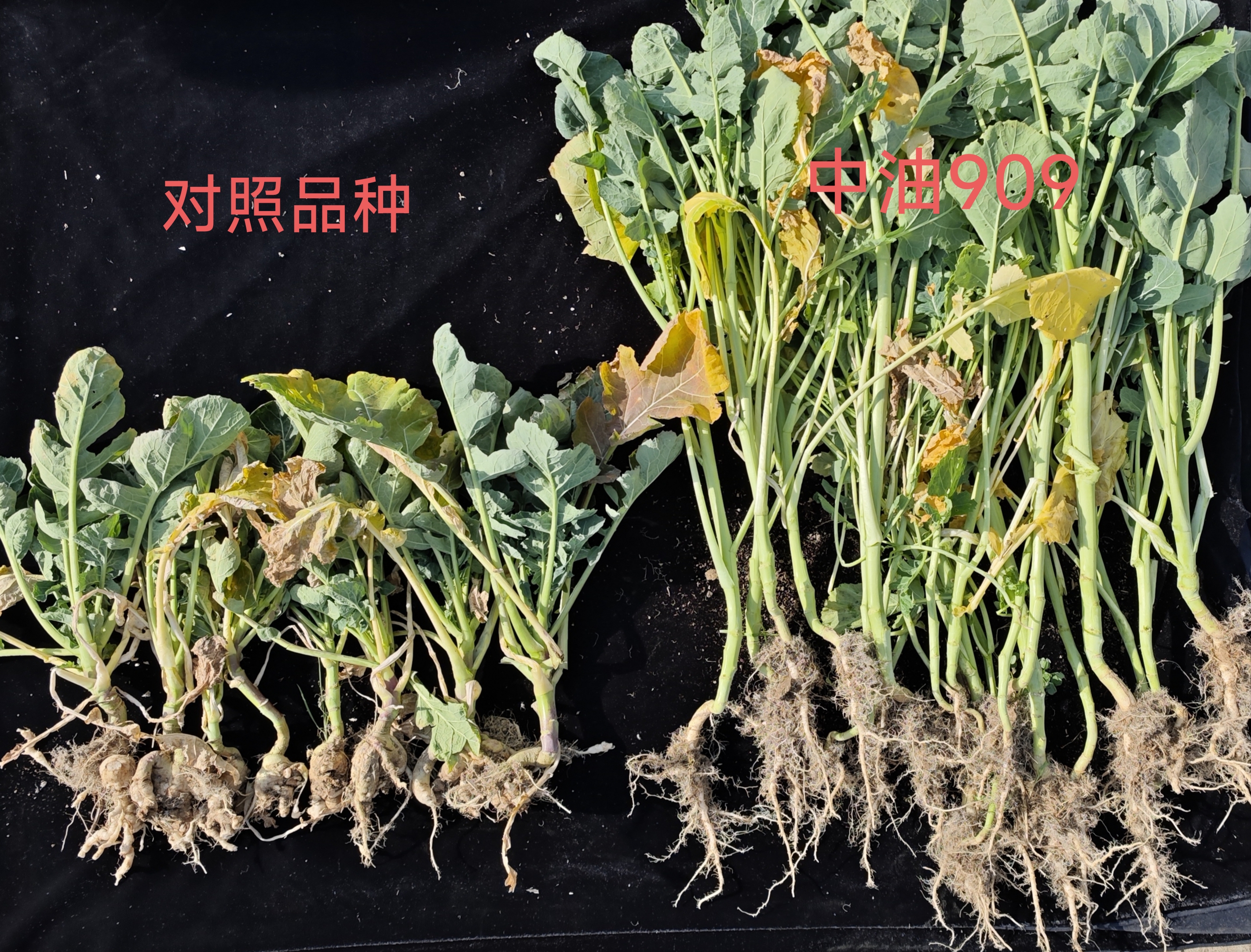 “中油909”与当地非抗病品种长势对照。