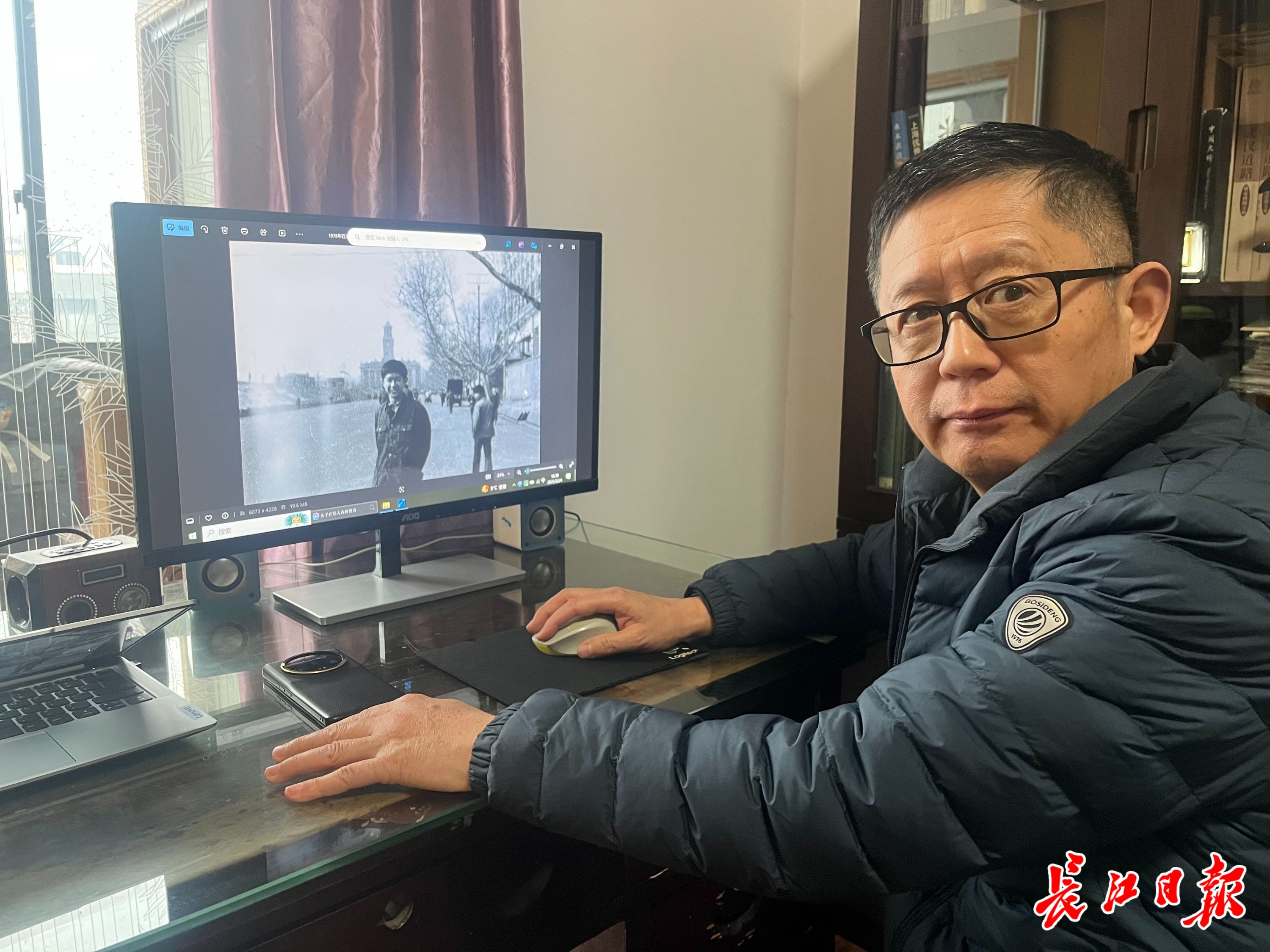 李亚军在家中接受长江日报记者采访,电脑中的照片是1978年他上高中时借邻居相机在沿江大道请人拍的他自己。 长江日报记者万建辉 摄