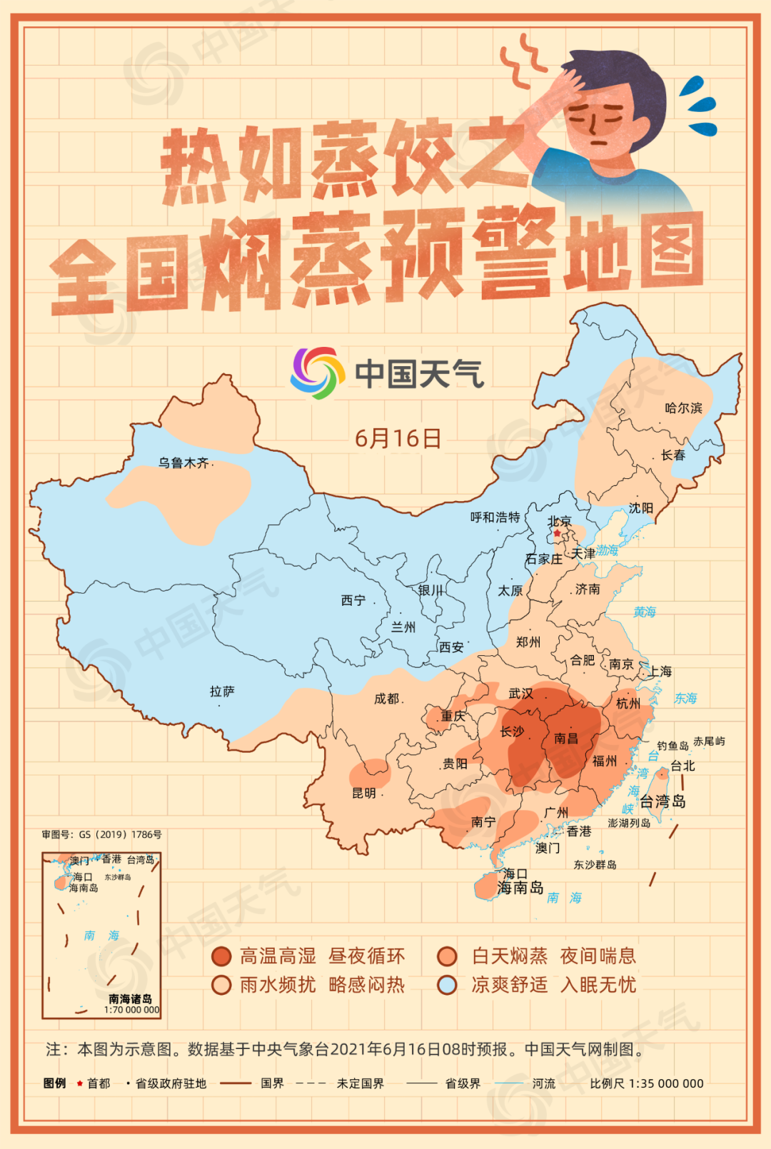 今起三天(6月16日至18日),我国南方迎来今年来最大范围高温闷热天气,不少地区开启“焖蒸”模式,不仅白天要应对“高温围攻”,晚上还要挑战“焖蒸入眠”,日最低气温逼近30℃。中国天气网推出全国焖蒸预警地图,看看你所在的城市是否闷热得难以入睡。