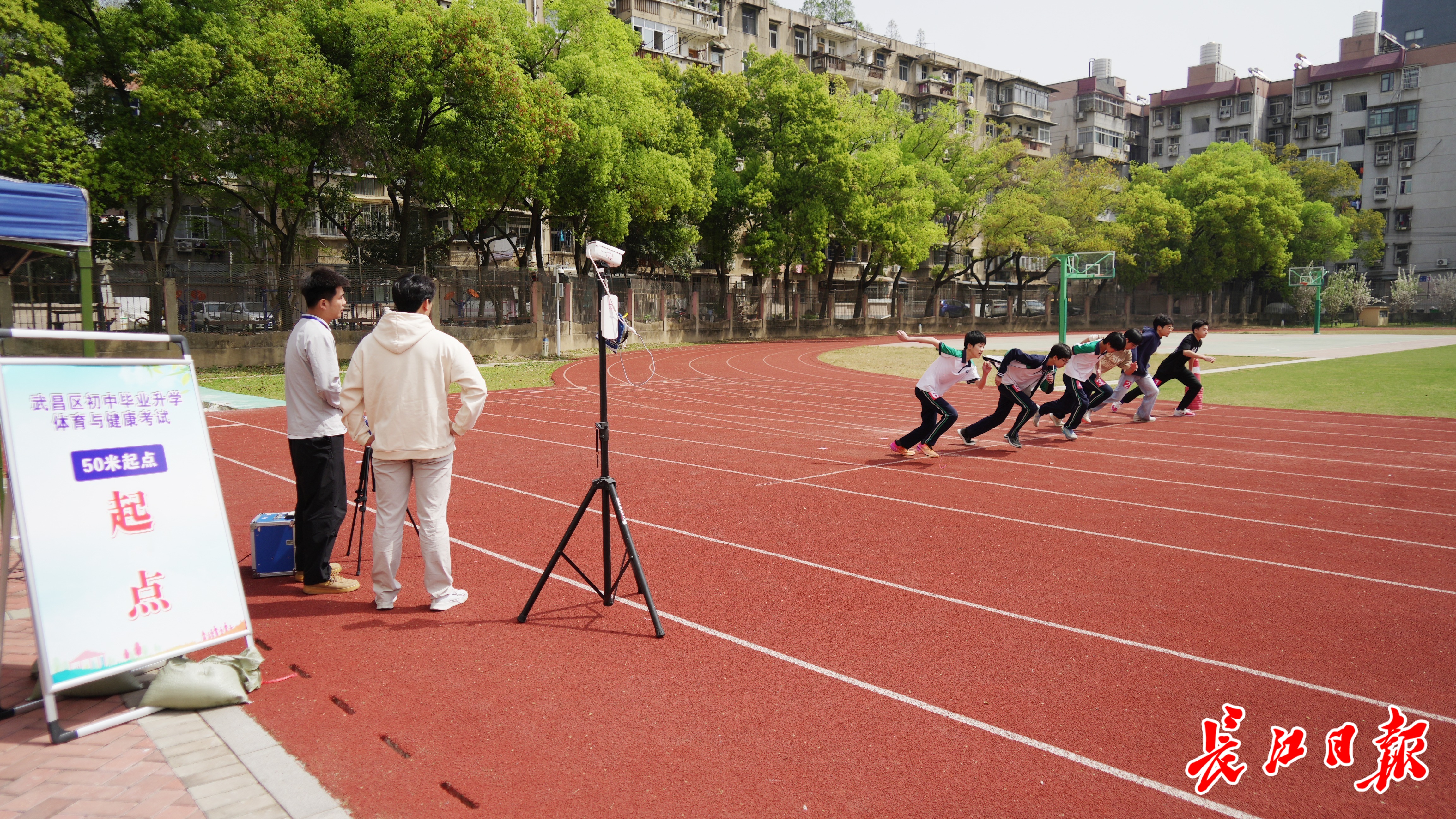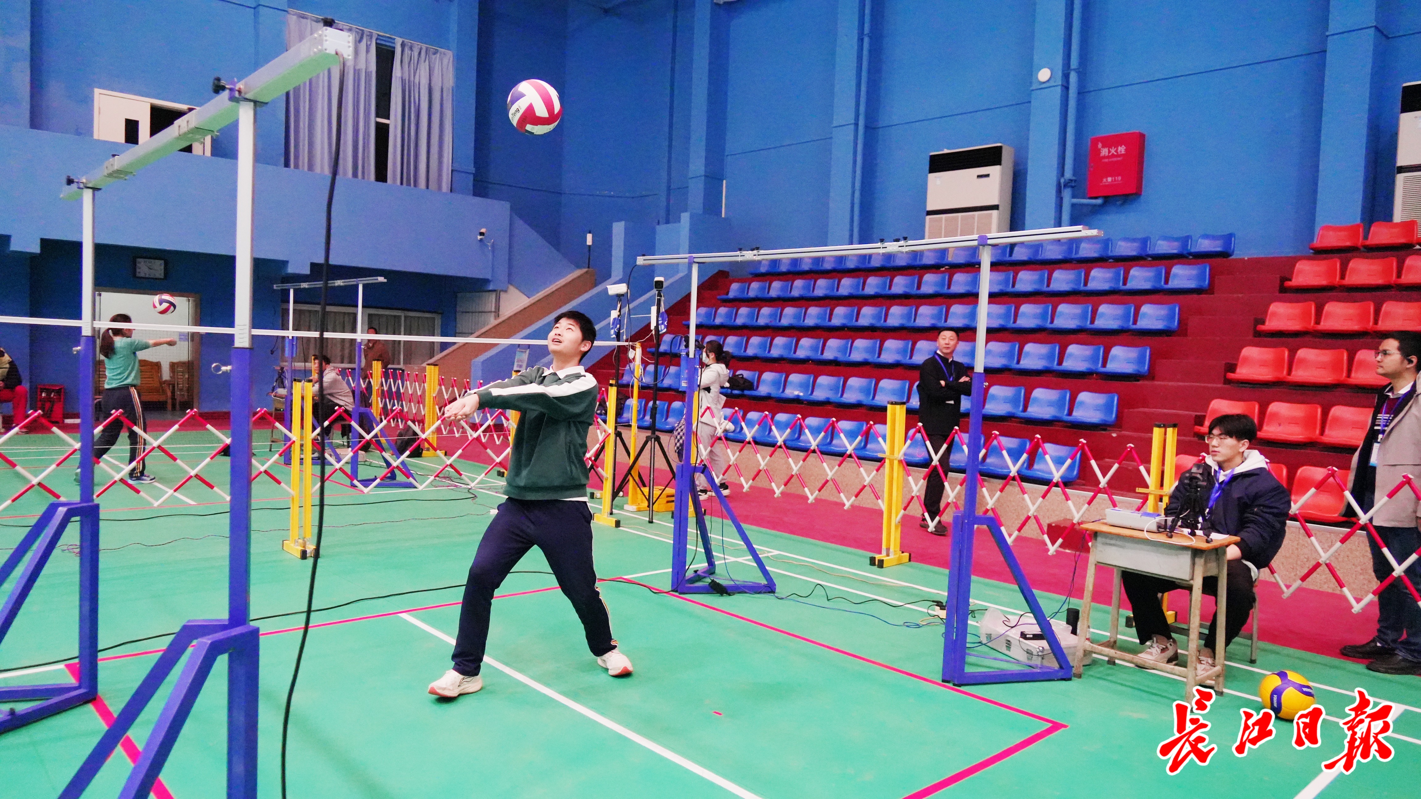 长江日报记者在测试现场感受到,考生入场检录、测试的过程流畅快捷,处处都有科技“帮忙”。50米跑测试中,一组学生跑完,成绩立即自动出现在场边屏幕上。排球垫球测试区域上方设有感应标志杆,学生垫球高度超过标志杆才能计数,地面立着的电子屏实时自动计数。
