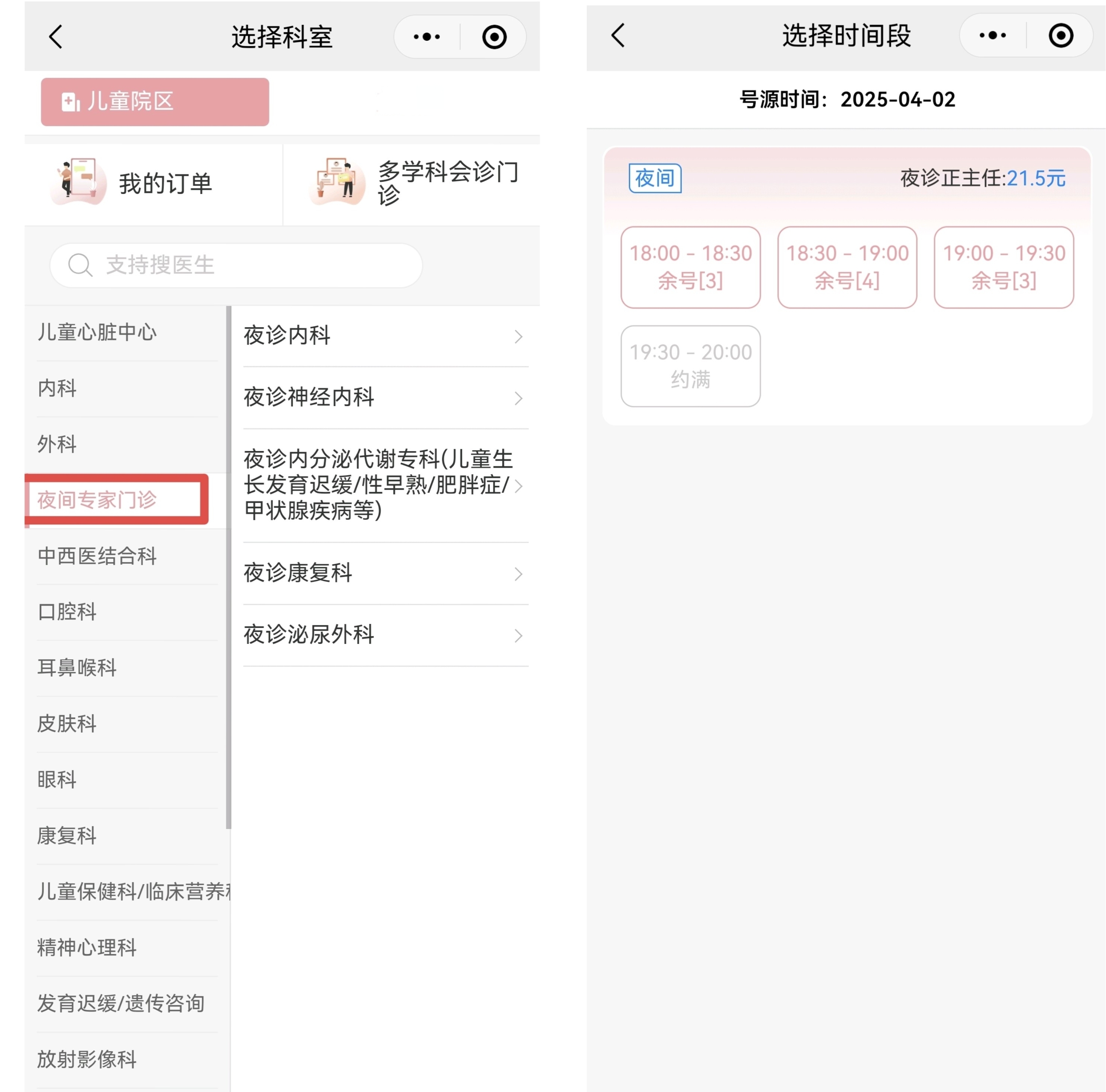 夜间专家门诊可线上预约挂号。医院微信公众号挂号系统截图
