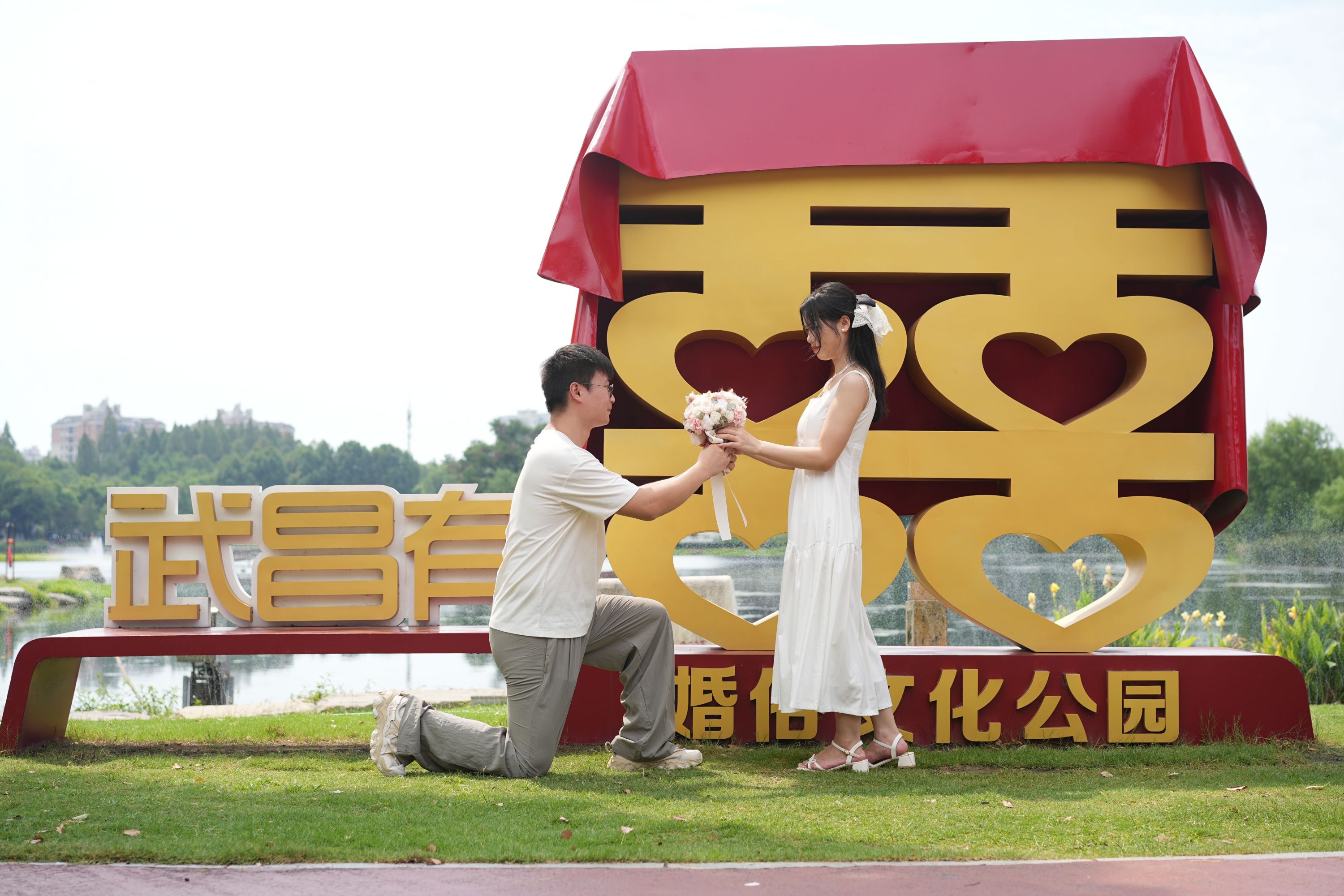 新人在武昌区民政局婚姻登记处门前的婚俗文化公园留影。通讯员曲佳慧 摄