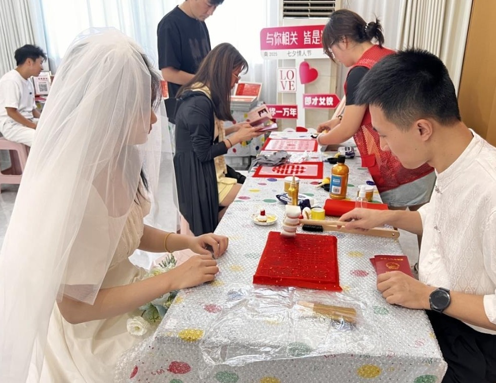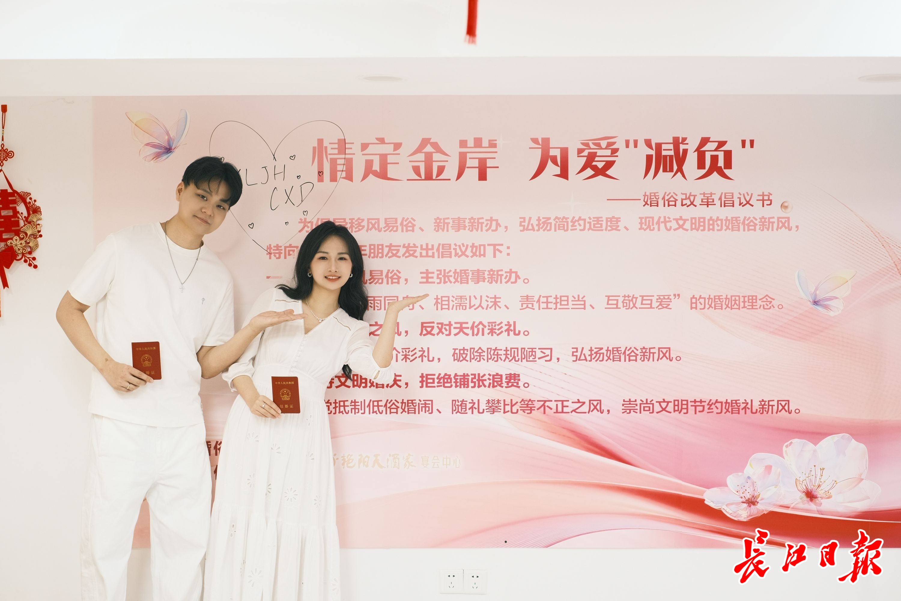 在江夏区民政局婚姻登记处,一场特色活动吸引了众多新人,通过拓印婚书、文明承诺打卡等环节,将传统文化传承与婚俗改革理念深度融合。
