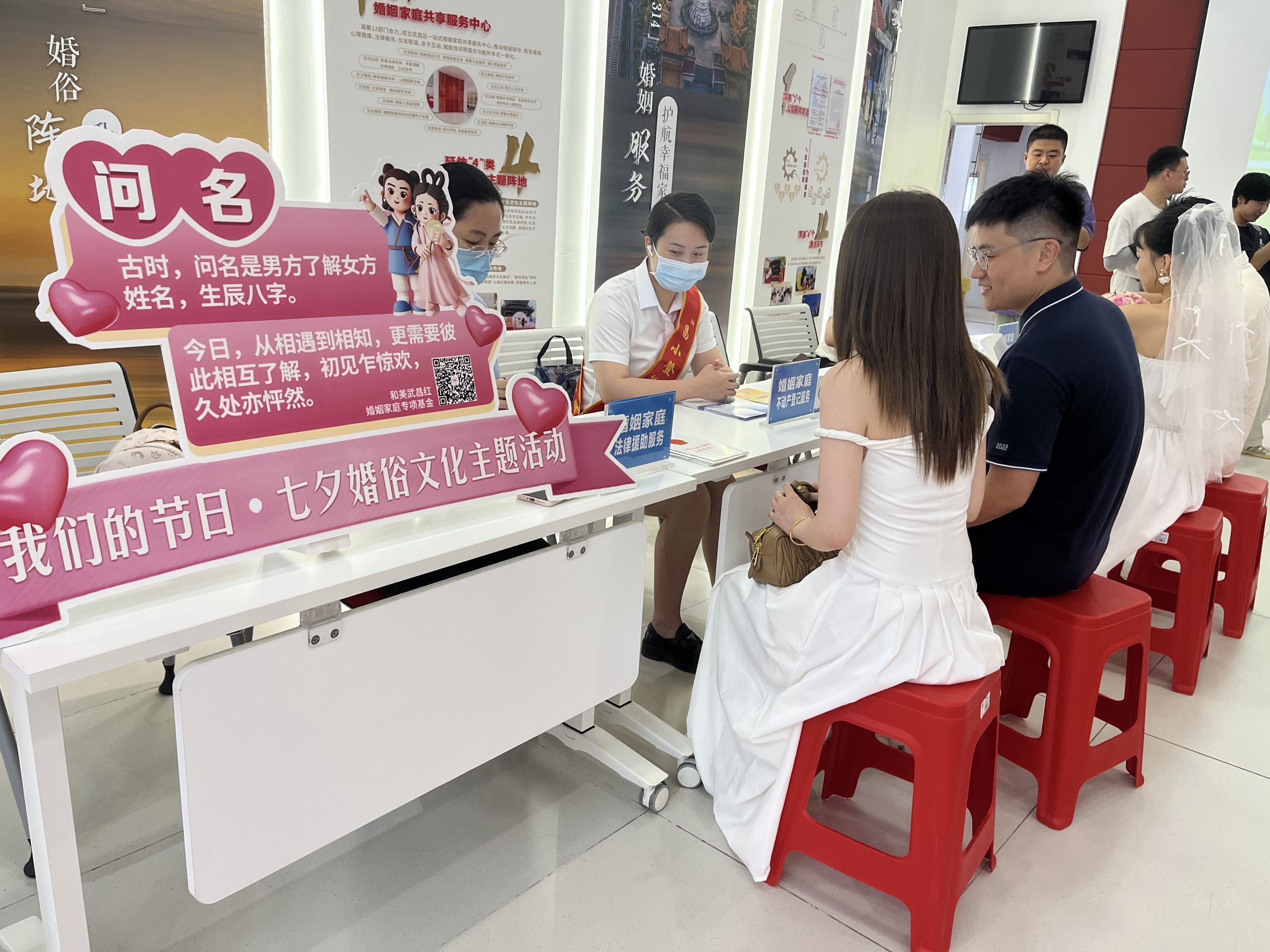 当天,婚姻登记处还举办了“婚俗新风寻礼记”打卡集章活动,在“纳采—问名—纳吉—纳征—请期—亲迎”传统六礼仪式里,新人们感悟婚姻的意义。
