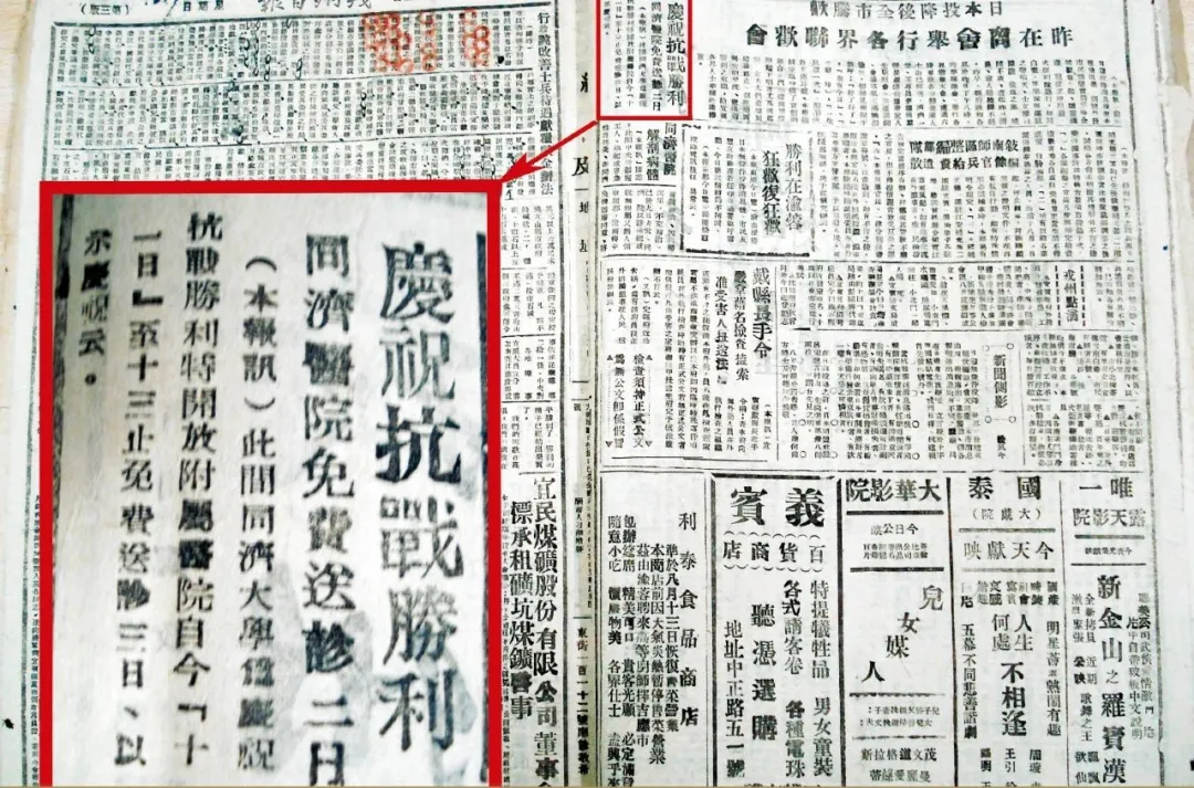 为庆祝抗战胜利,医院在《戎州日报》上刊登送诊告示。