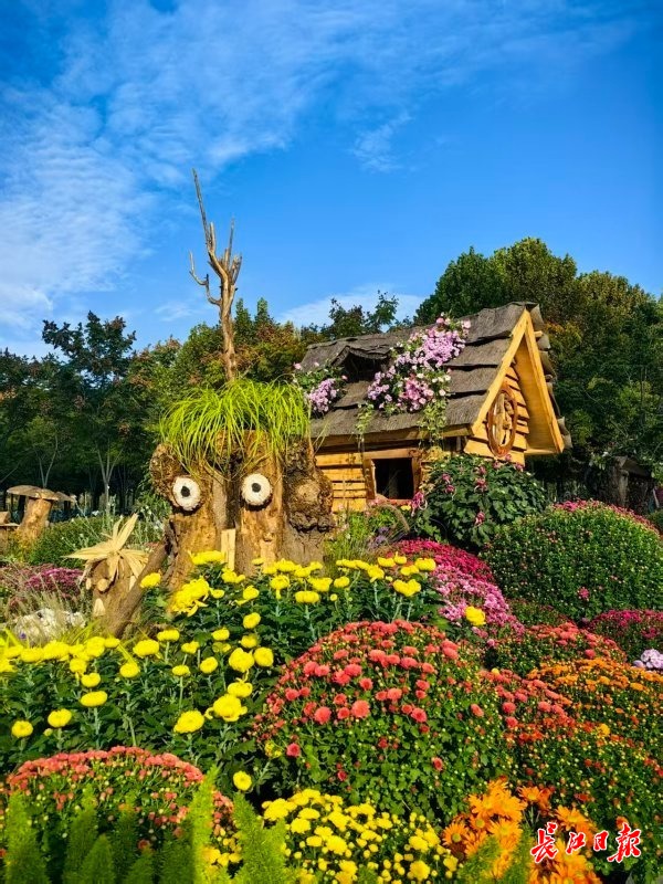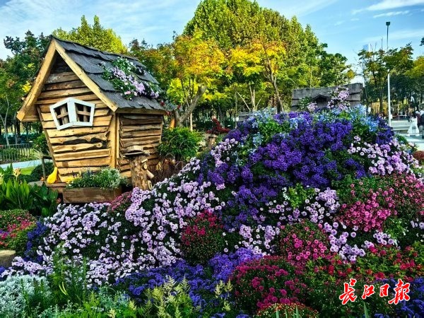 露天区域有3处菊花小景,设计新颖,各具特色。北边为“深秋林语”打卡点,3座特色小木屋、数十个用木桩制作的童话精灵,在橙黄、蓝紫等色系花园菊的烘托下,充满奇幻色彩。
