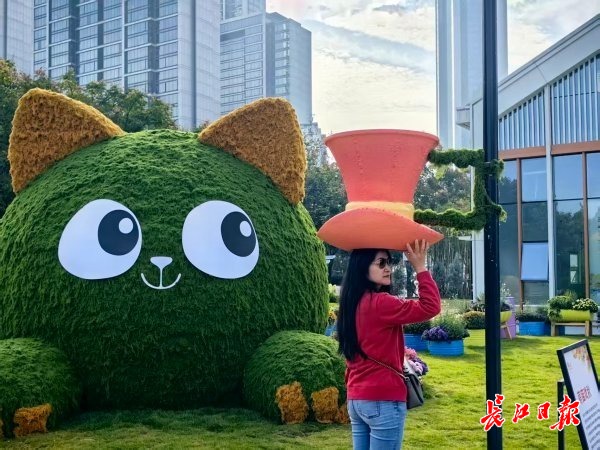 南侧“萌猫戏秋”菊花小景,主体是一只圆滚滚的大眼萌猫,全身覆盖着仿真苔藓,毛茸茸的十分可爱。萌猫前面的灯杆上,悬挂着一顶高高的礼帽,吸引游客纷纷上前,踮起脚跟好给自己“戴高帽”。沙湖公园园林工程师张倩介绍,这只萌猫高约2米、长约4米,由今年武汉世界花园大会的竹编地球“改编”而成。“摇身一变”后,几乎没人能认出来。