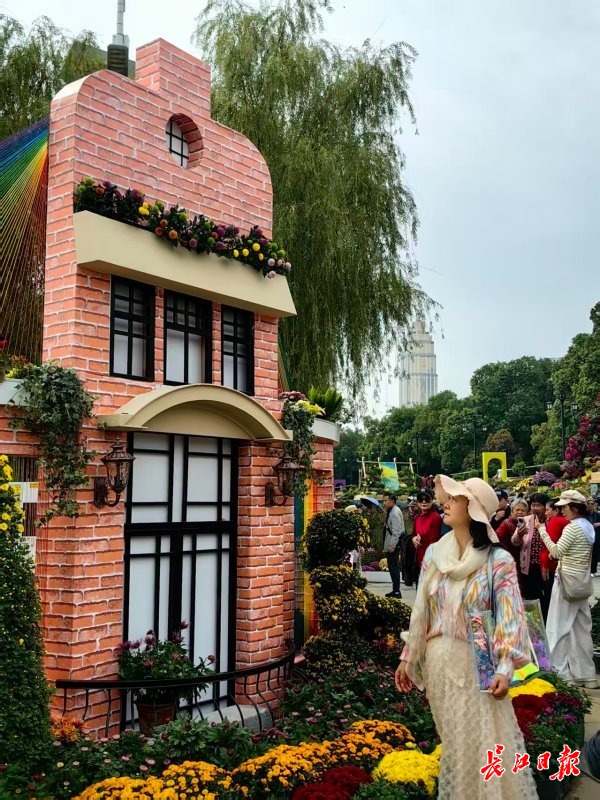 鲜花台阶下方的菊花小景观赏区,汇集了31家参展单位精心制作的作品,游客如织。江岸区打造的“绿韵江城 共享未来”菊花小景,复刻了巴公房子、保元里等历史建筑元素,与光谷马蹄莲等现代建筑元素呼应、交织,呈现出浓郁的烟火气。市民穿梭其间打卡,倍感亲切。