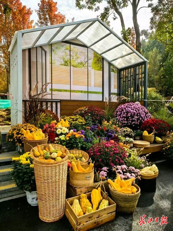 中轴线两侧12个创意阳台,被布置成以丰收为主题的创意打卡点。其中一个打卡点,用10余种小型南瓜与菊花融合,给人新颖别致之感。湖北大学师生创作的“识五谷”菊花小景,展示了稻粱菽麦稷,让市民游客在赏花的同时,能辨识五谷。