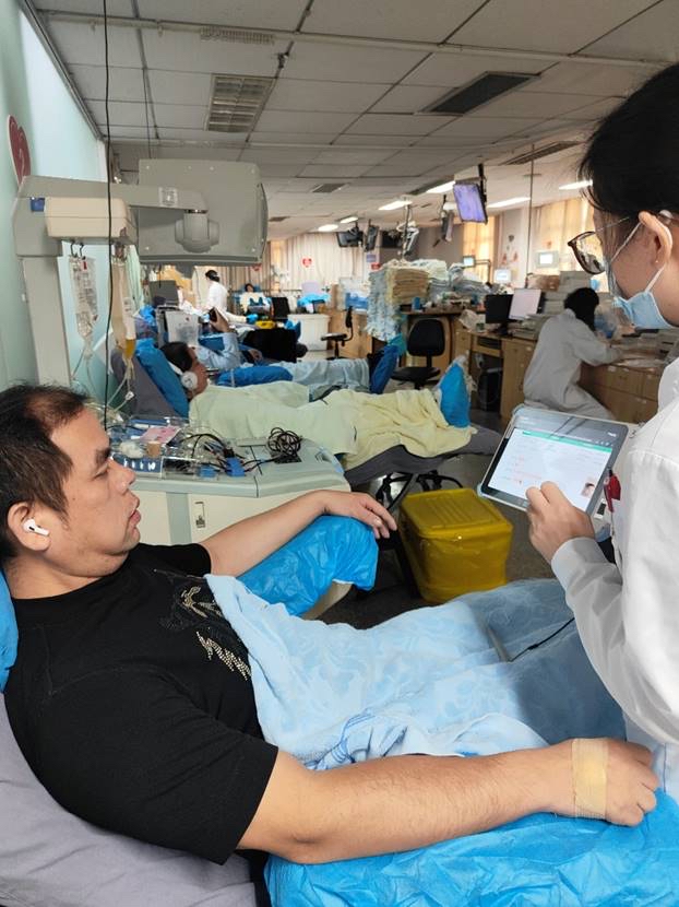 医护人员正通过电子签名板告知无偿成分献血者赵业云检查结果。通讯员肖莉娇 摄