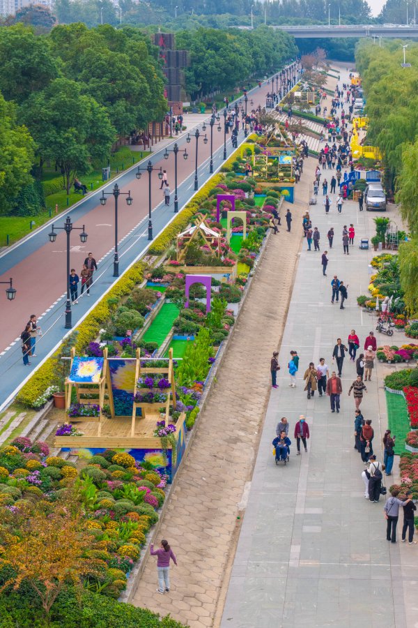 据汉口江滩主展区“花街”负责单位武汉市绿化服务中心养护科负责人万奕表示,不同于传统规则对称的花卉布置,“花街”景观带采用了100多个品种,大小各异,颜色不同的植物混合种植,形成以菊花为主的时花“花境”,例如:浅蓝色的翠菊“小卡罗”,紫色的球菊“紫樱桃”、金黄色的球菊“吉吉橙色”、红色的“海莉红棕”等混搭,让游客仿佛走进一条流动的秋日彩带。