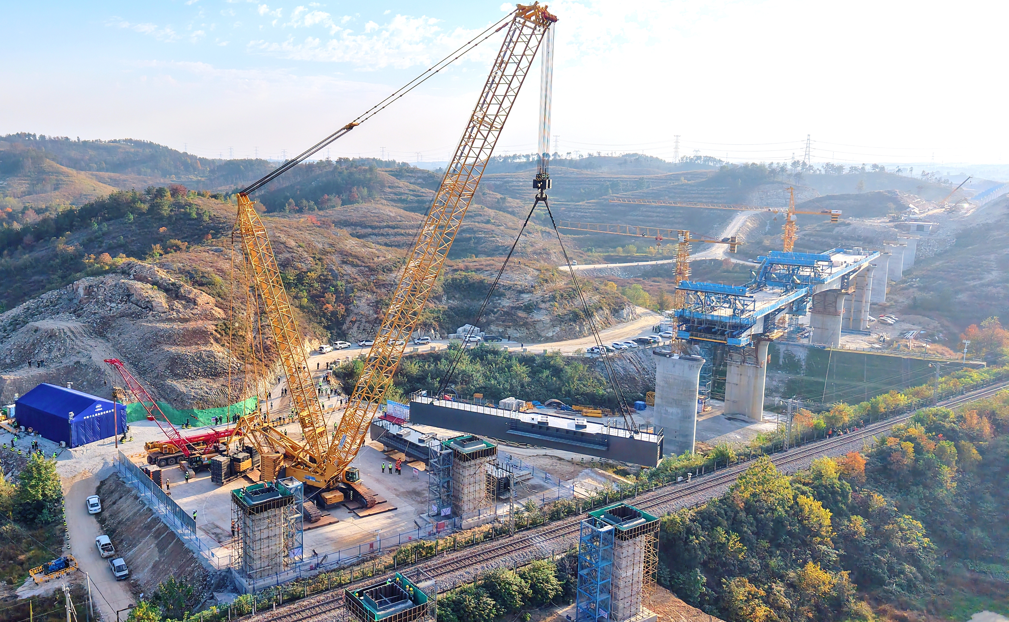 合武高铁跨麻武线特大桥钢盖梁吊装施工。 通讯员秦绍辉 摄