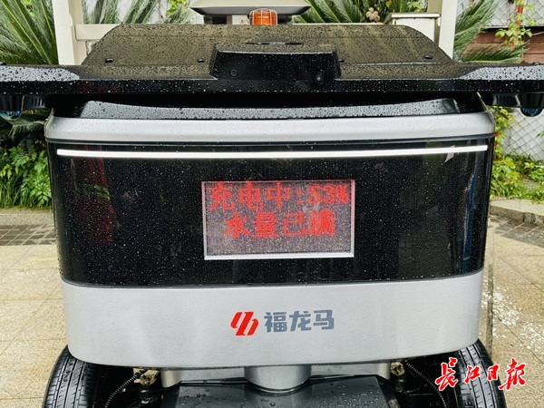 令人称奇的是,它能自主完成充电、补水和垃圾转运等操作:完成清扫任务后,机器人会自动返回位于西广场的基站,进行无线充电和加水,显示屏上实时显示充电进度和水量数据。