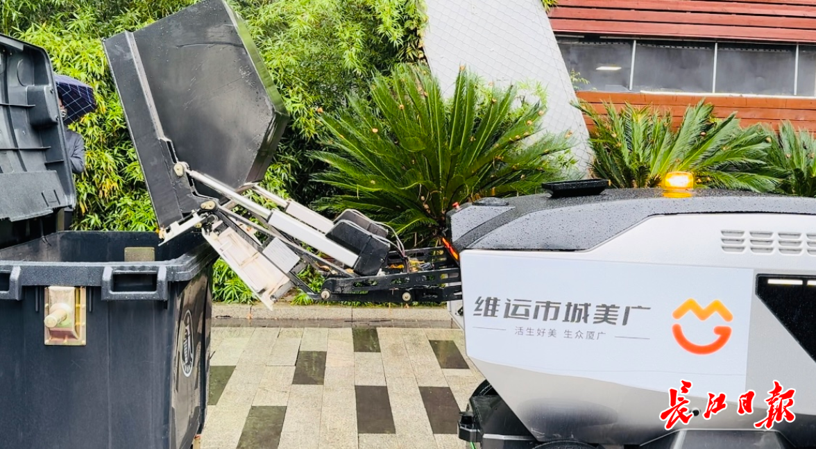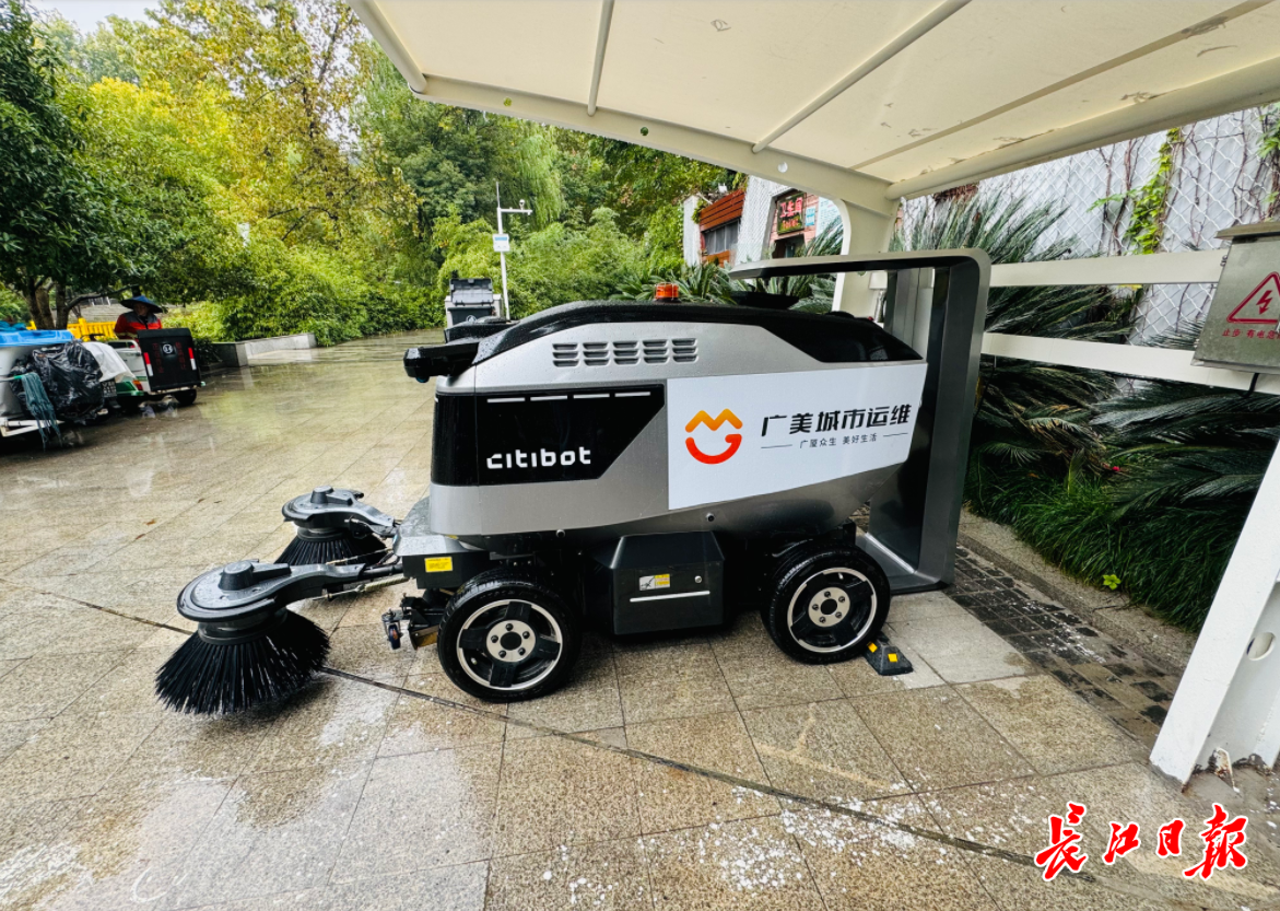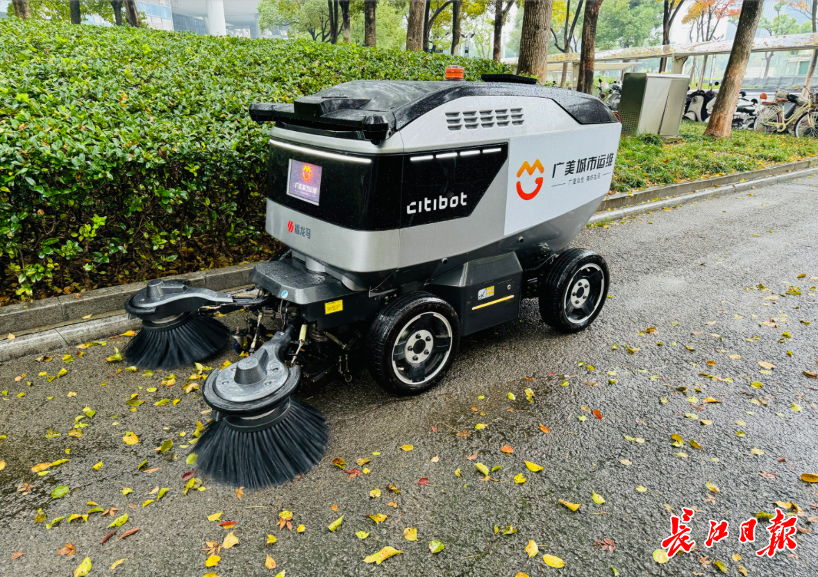 长江日报记者在采访时看到,这台智能清扫机器人正高效运作,前端的旋转扫盘快速清理着地面垃圾,尤其在处理落叶时表现优异,所经之处干净整洁。
