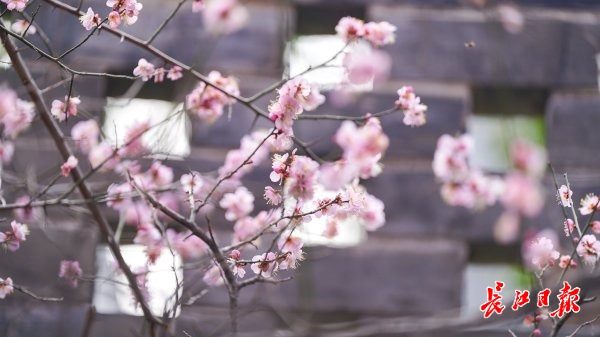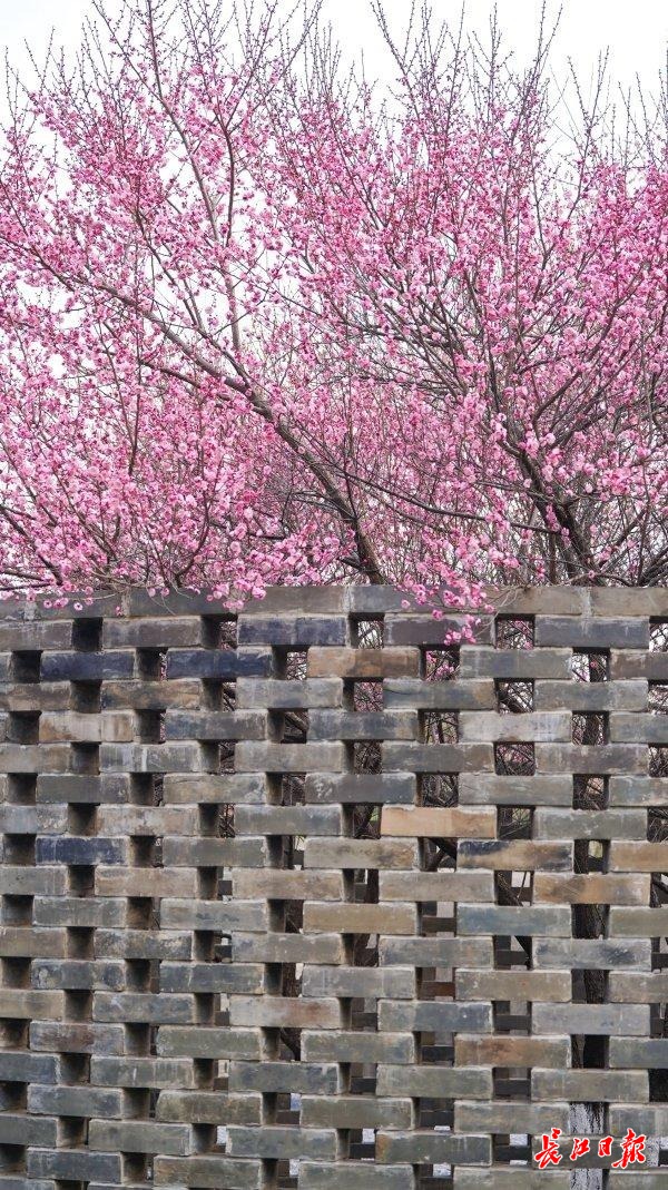 在镂空砖墙衬托下,梅花分外鲜艳。记者李子云 摄