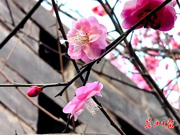 武汉园博园管理人员张文华介绍,这三株梅花有两株是朱砂梅,花色深红;一株是宫粉梅,花色粉红。眼下均已进入盛花期,预计花期可持续10天左右。“天气预报说武汉即将降雪,来超级‘花篮’踏雪寻梅,别有一番情趣。”他笑道。